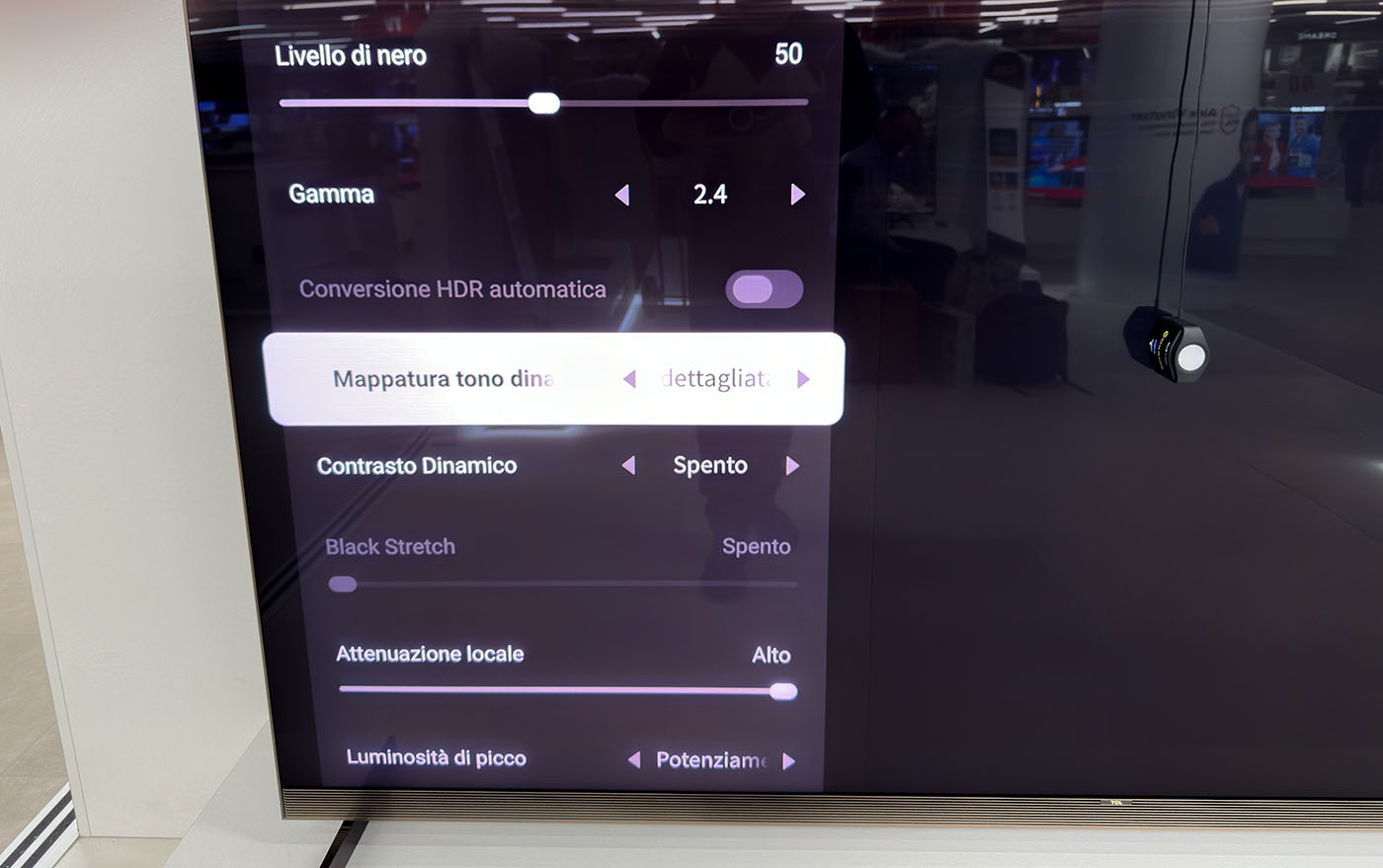 Il primo riguarda il tone mapping, ovvero il processo che adatta i contenuti in HDR alle capacità del pannello. Il nuovo SQD-Mini LED non ne ha praticamente mai bisogno poiché ha una tale riserva di luminanza da poter riprodurre quasi tutti i contenuti 1:1, cioè esattamente come sono stati realizzati all’origine. La conferma si ottiene attivando la mappatura dei toni dinamica, che analizza le immagini in tempo reale per offrire un adattamento più evoluto e visivamente appagante. L’unico adattamento realmente necessario riguarda i rarissimi contenuti masterizzati a 10.000 nit, che sono numericamente ben poco rappresentativi. Il secondo vantaggio è la capacità di rendere l'HDR perfettamente fruibile in qualsiasi ambiente.