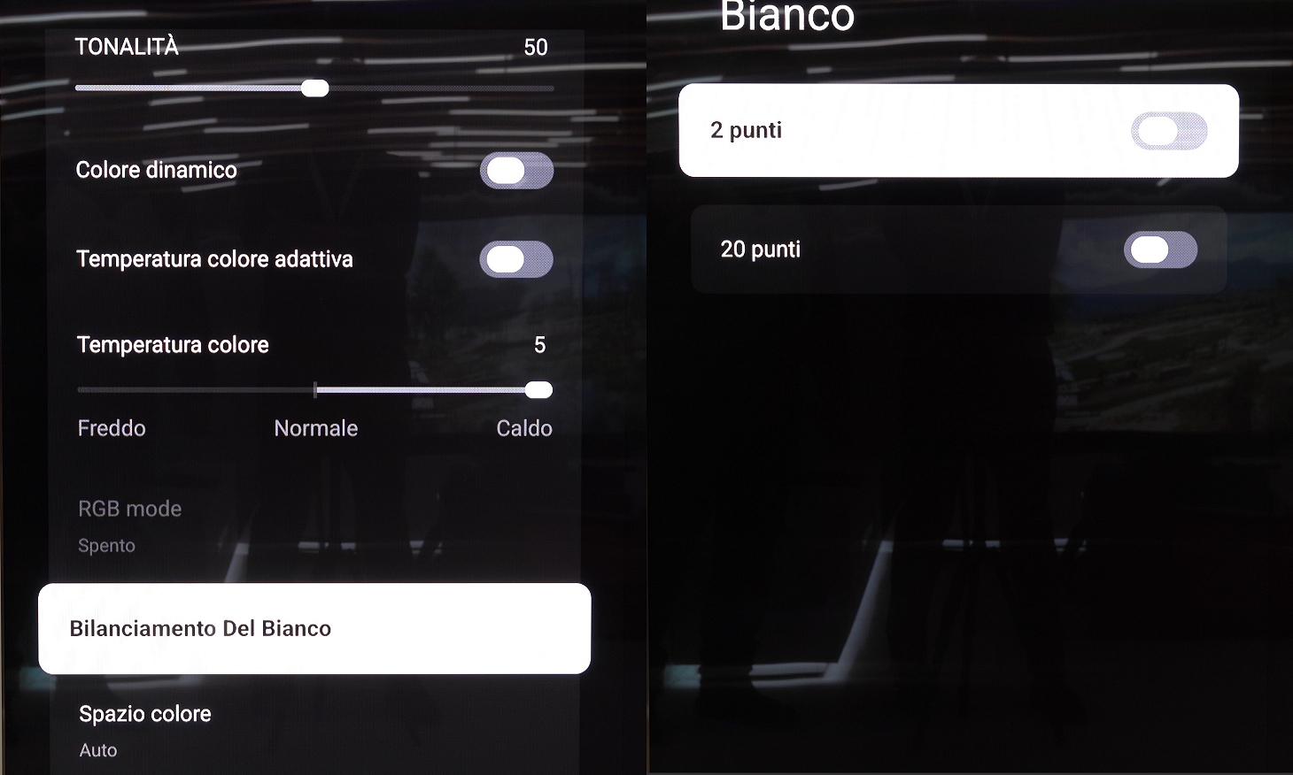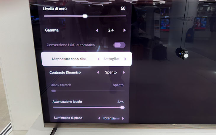 Decidiamo quindi di dare un'occhiata al menù immagine per verificare quale sia il Tone mapping selezionato delle modalità predefinita e se c'è margine per migliorare la proporzione e il picco dei valori di luminanza, bilanciamento del bianco e colori. Iniziamo subito con l'impostazione del bilanciamento del bianco su due punti per correggere la leggera dominante verde, soprattutto sulle alte luci. Notiamo anche che rimane attiva la selezione del gamma che in HDR può sembrare improprio ma che permette di modulare meglio i livelli di luminosità sulle medie luci. In default è impostato su 2.2 e decidiamo quindi di provare il valore 2.4.
