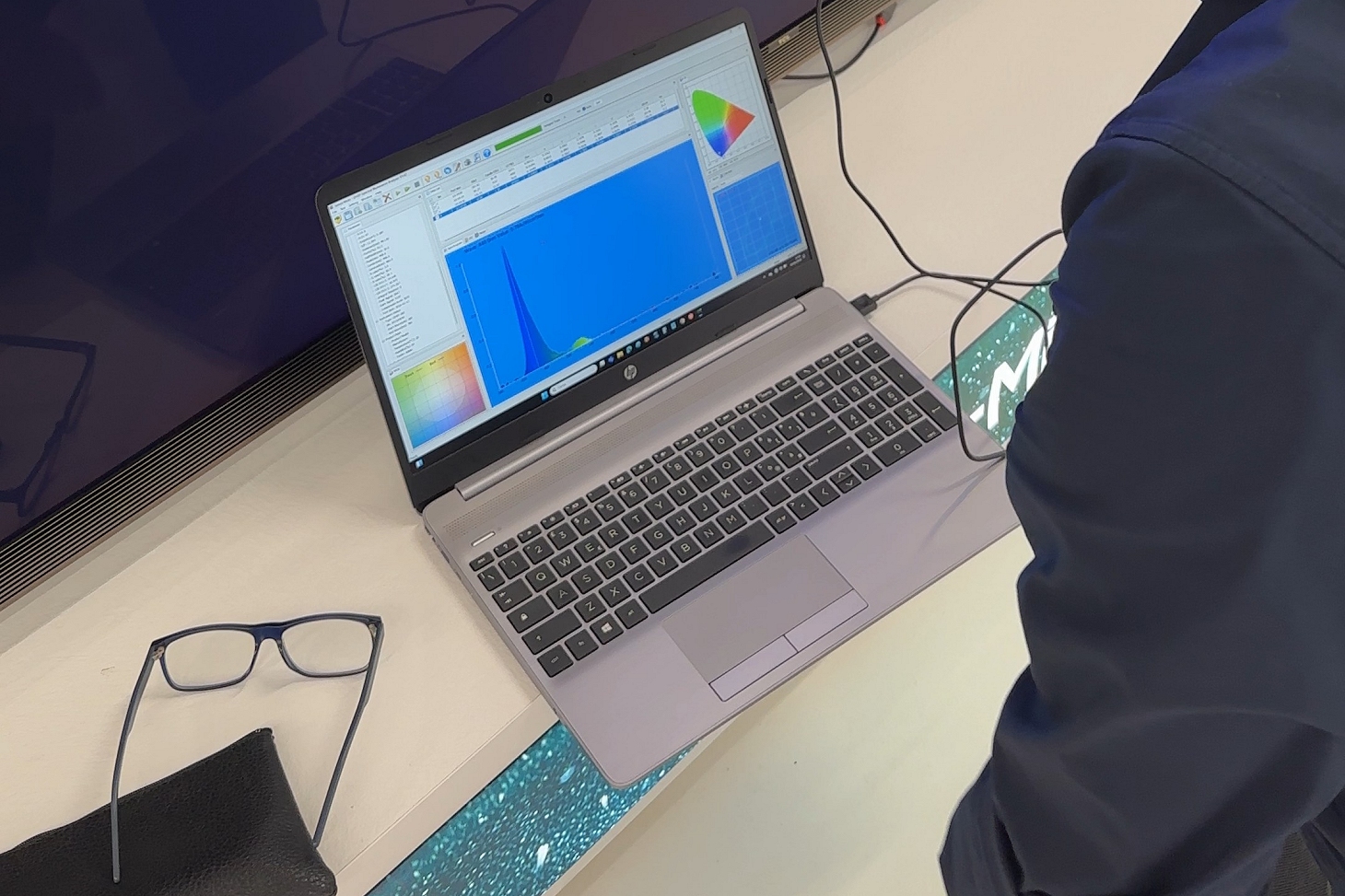 Prima delle verifiche di copertura cromatica con il colorimetro abbiamo eseguito un'analisi dei colori primari e del bianco con uno spettrometro ad alta risoluzione che ci ha permesso di analizzare la distribuzione spettrale per calcolare anche la massima copertura del gamut considerando le dominanti delle singole componenti cromatiche rispetto a quelle di riferimento.
