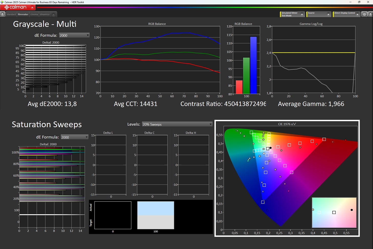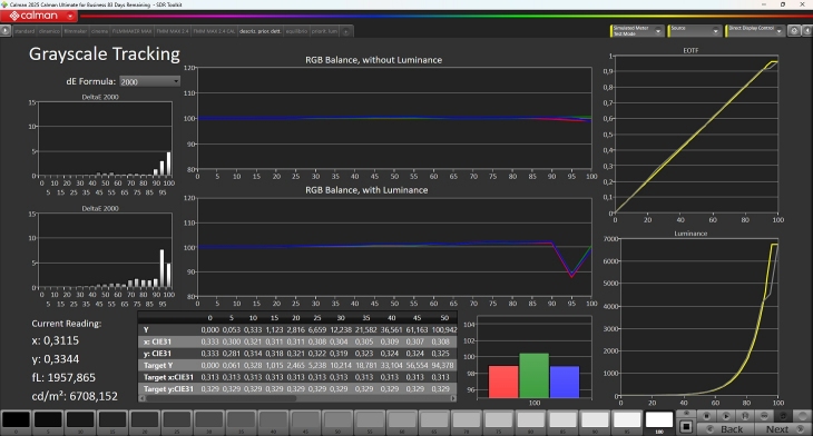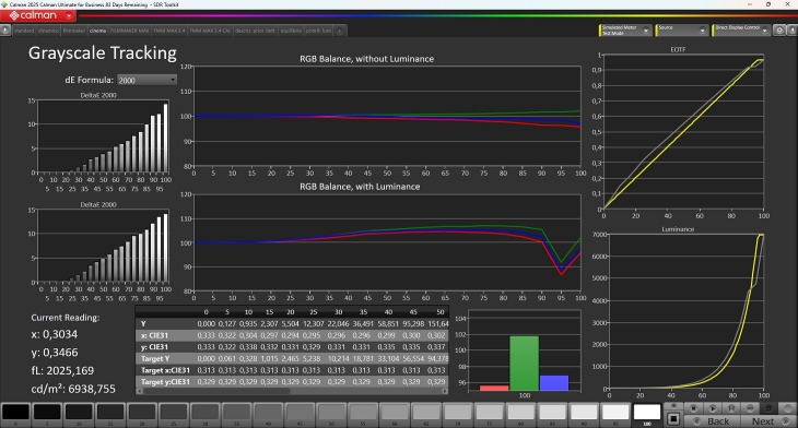 Il risultato è davvero notevole. Ancor più che sono bastati pochi secondi, senza dover intervenire con la calibrazione del bilanciamento del bianco sui 20 punti ma quasi esclusivamente sulle alte luci. Il picco di luminanza arriva a 4.500 NIT e rimane il roll-off al 90% ma ora tutti i livelli di luminanza della scala dei grigi sono ben riprodotti senza esagerazioni e con bilanciamento del bianco decisamente corretto.
