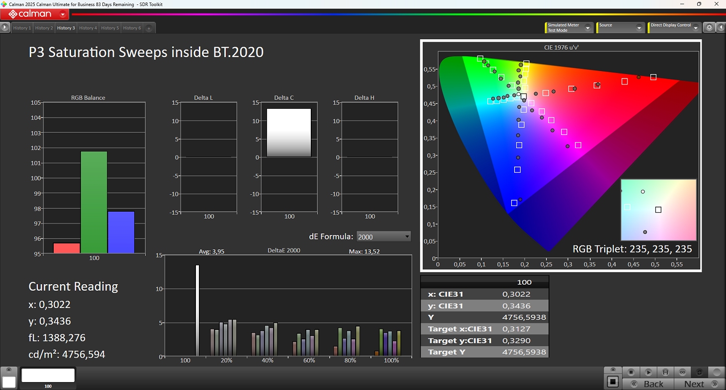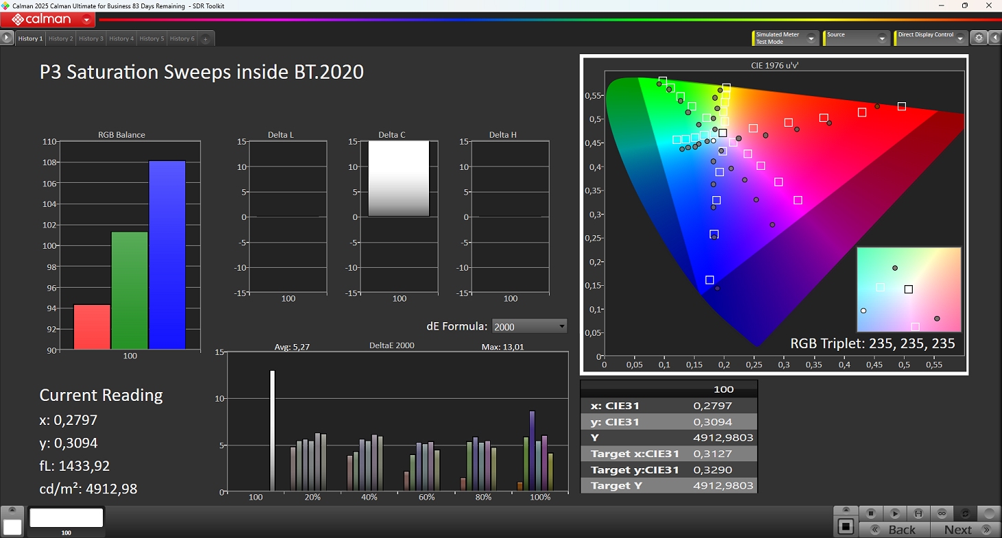 Le misure con il software Calman Ultimate indicano una copertura massima dello spazio colore che è del 91,6% del triangolo di gamut REC BT.2020, dato elevatissimo in assoluto ma comunque ben diverso dal 100% che era stato anticipato a gennaio. Il dato di copertura del triangolo DCI-P3 che, vi ricordo, è quello di riferimento per la quasi totalità dei contenuti disponibili è del 98,3%, quindi eccellente.