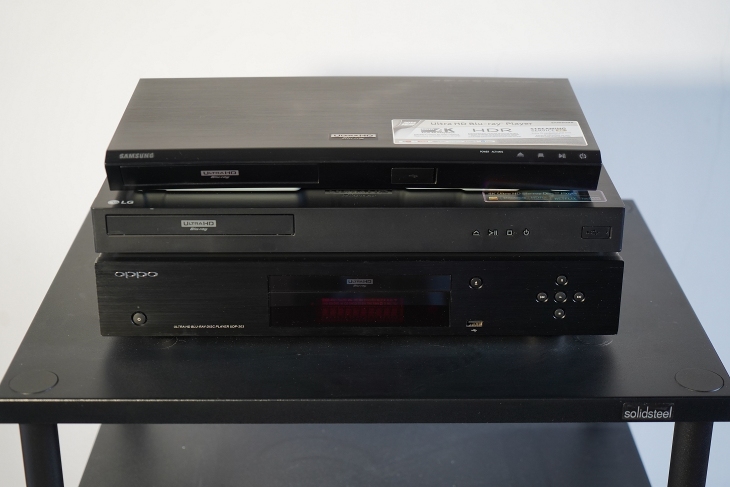 Dall'alto Samsung UBD-K8500, LGE UP970 e Oppo UDP-203