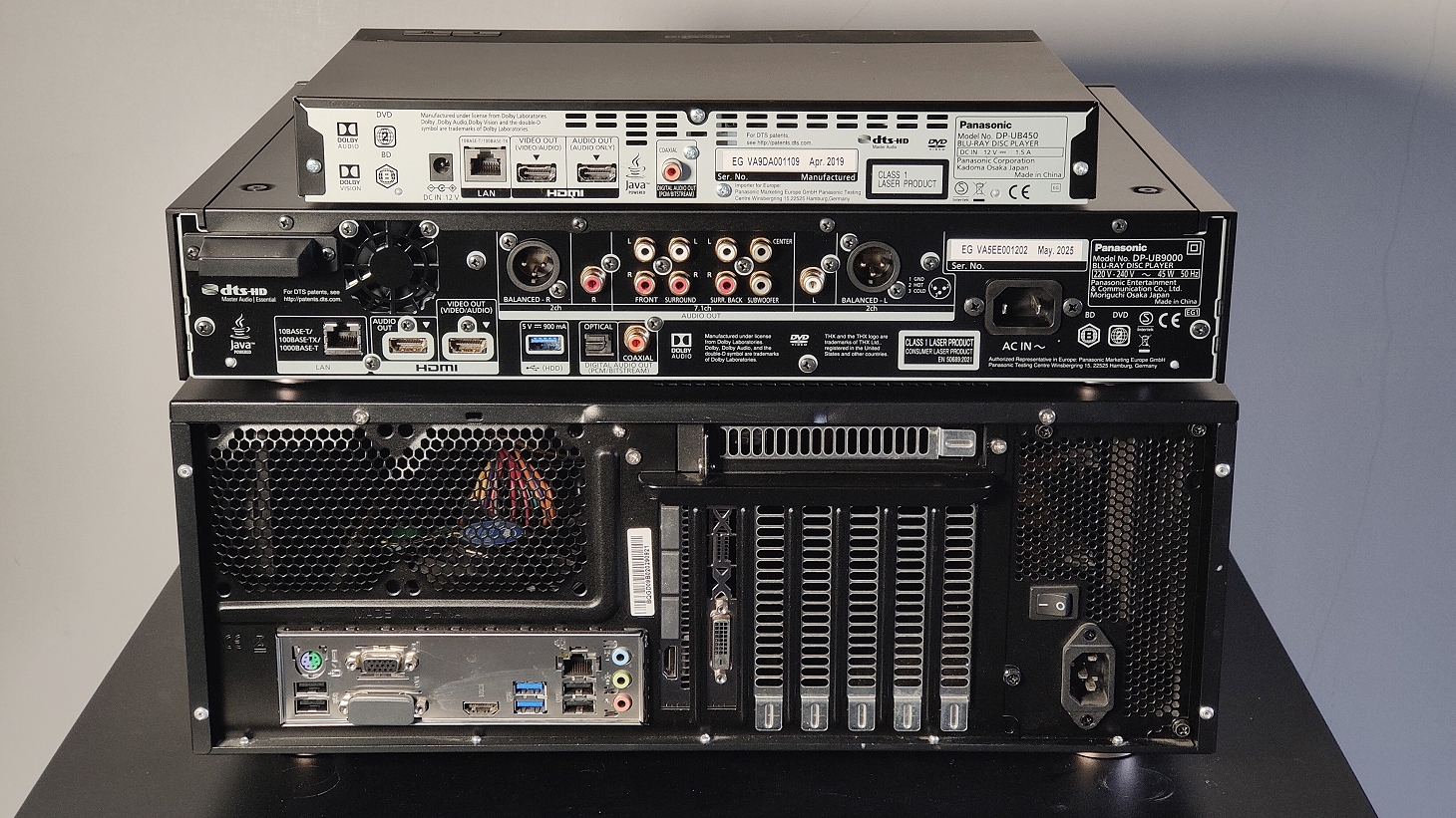 Il DP-UB450 ha un costo di circa 260 euro, ha due uscite HDMI, un'uscita audio digitale coassiale, la porta LAN e una sola porta USB frontale; è compatibile HDR10+ e anche Dolby Vision. Buona la compatibilità con i file: legge anche i file DSD, DFF e DSF stereo fino a 11,2 MHz e 5.1 fino a 5.6 MHz. Il DP-UB820 costa poco meno di 400 euro ed è un prodotto interessante perché ha molte cose del prodotto di fascia più alta di cui parleremo tra poco. Ha due uscite HDMI, un'uscita audio digitale ottica, la porta LAN e due porte USB, una 3.0 sul retro e una 2.0 davanti. Ci sono anche le uscite audio analogiche su PN RCA per 7.1 canali; è compatibile HDR10+ e anche Dolby Vision. Buona la compatibilità con i file: legge anche i file DSD, DFF e DSF stereo fino a 11,2 MHz e 5.1 fino a 5.6 MHz.