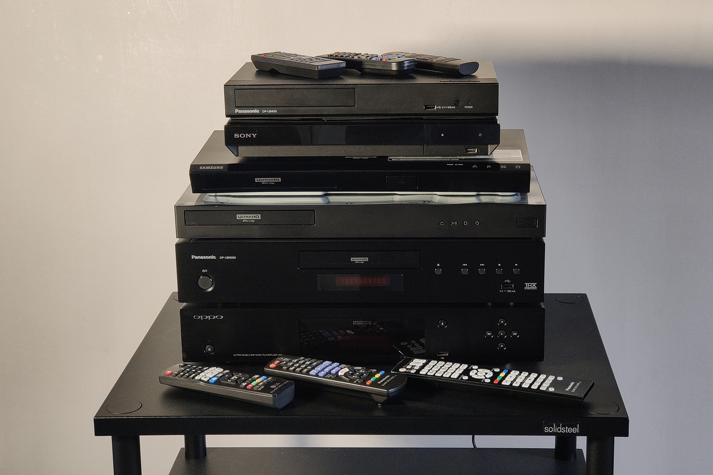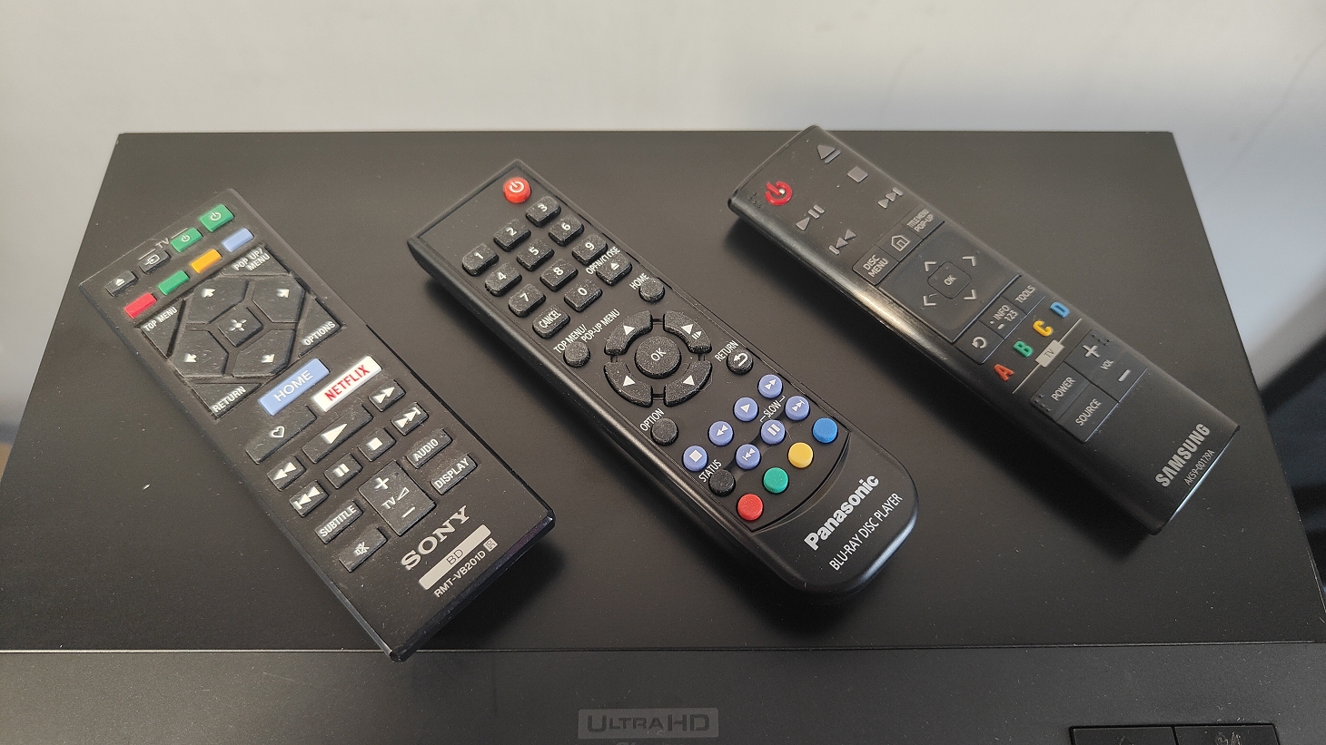 Telecomandi del Sony UBP-X700, Panasonic DP-UB450 e Samsung UBD-K8500