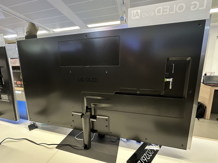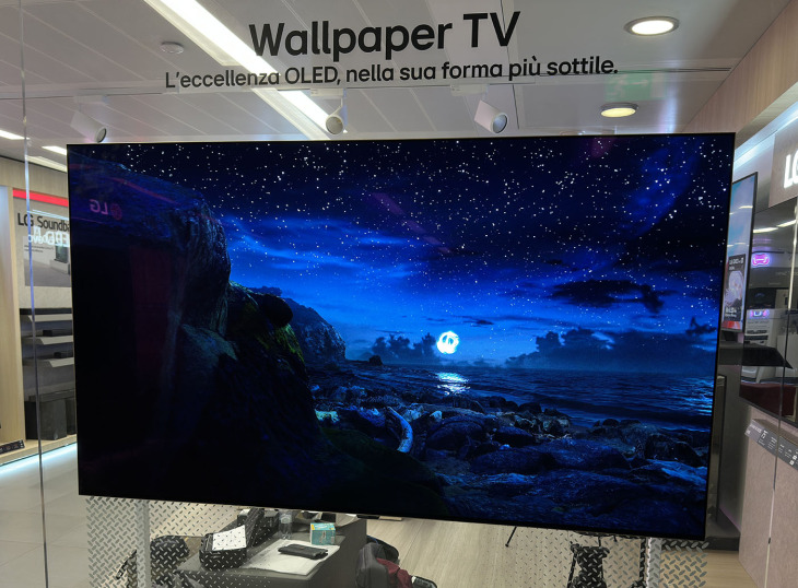 Non c’è un attacco VESA ma una soluzione proprietaria che si fissa in prossimità degli angoli superiori. Lo schermo è a filo della parete, come un quadro: nello showroom LG il TV è appeso a una lastra trasparente e l’effetto è davvero scenografico.