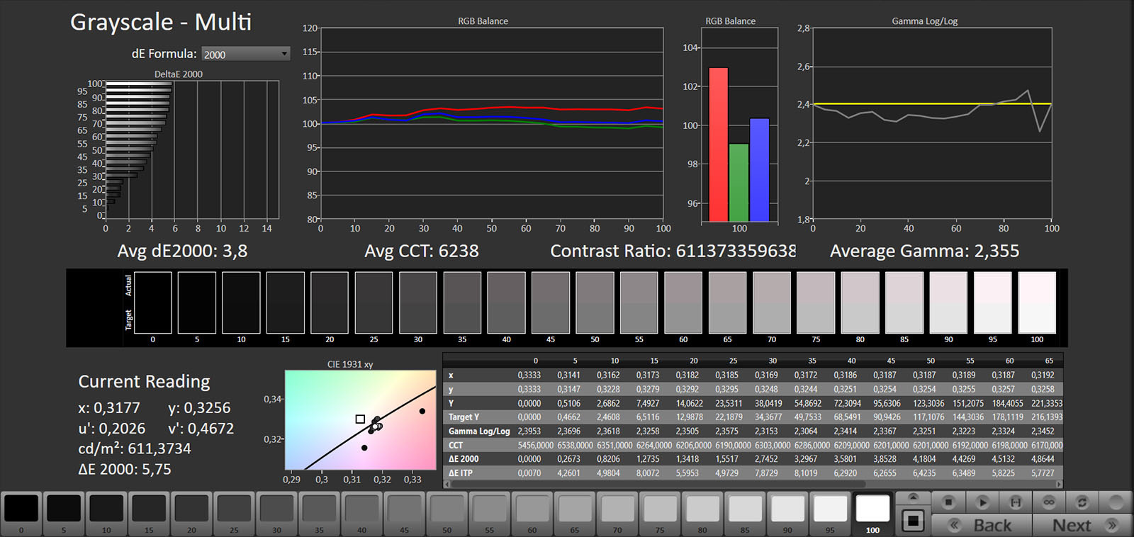 La linearità è ottima e l’errore molto basso: siamo a 1,6. La stessa precisione si ritrova anche nei colori: il DeltaE medio sul color checker è 0,89 con un massimo di 2,2.
