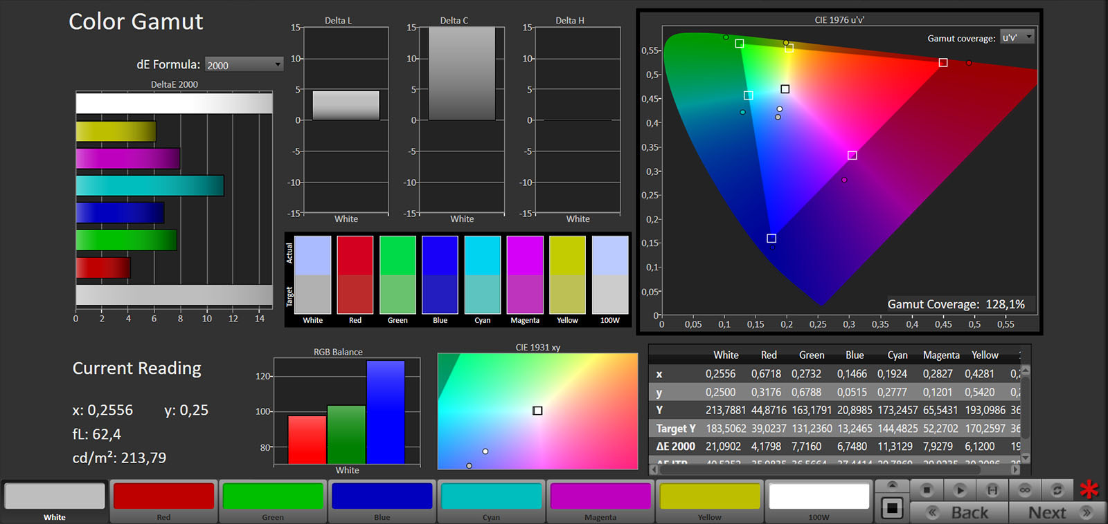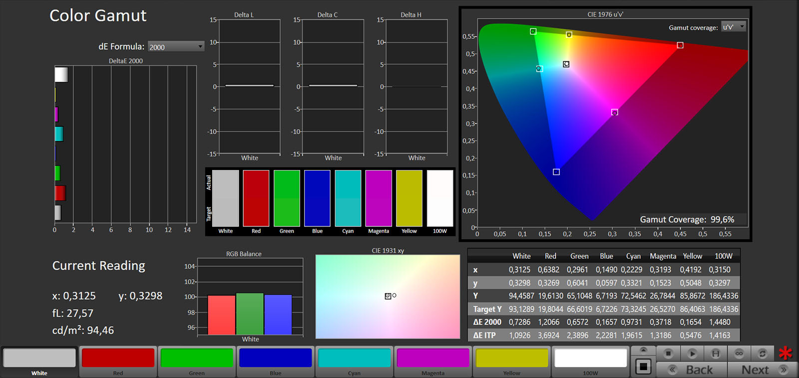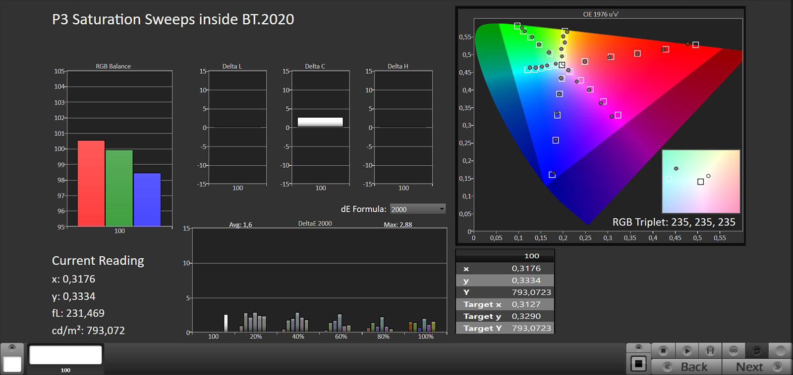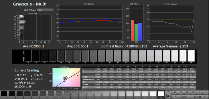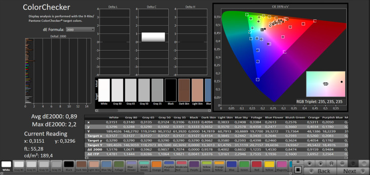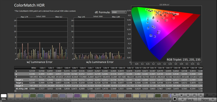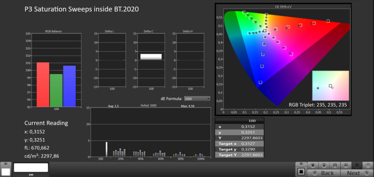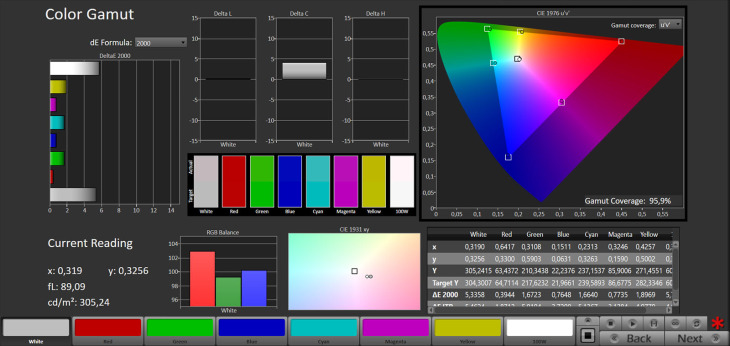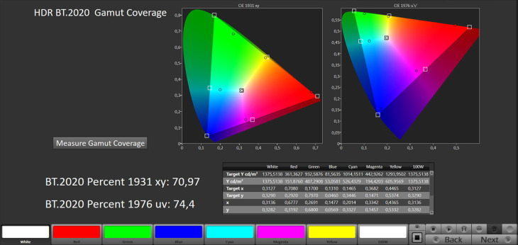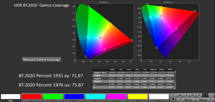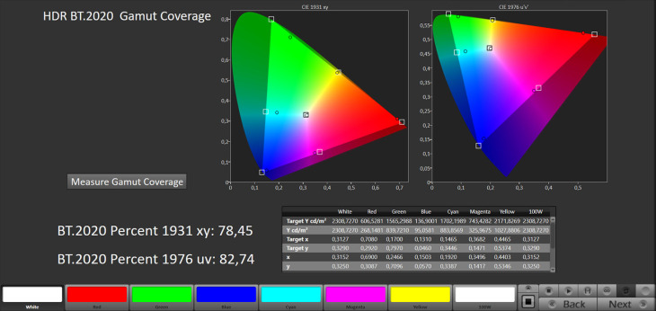 Lo spazio colore BT.2020 è coperto al 72% xy e 75,94% uv, mentre il DCI-P3 si attesta al 98,8% xy e al 99,64% uv.
