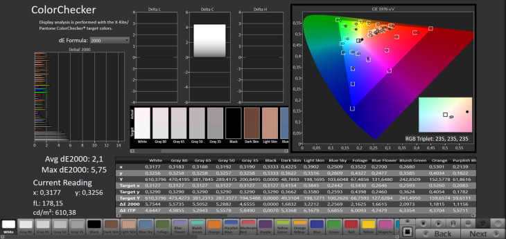 La taratura di fabbrica si conferma di alto livello anche sui colori: il DeltaE medio è 1,3 sul color checker e 1,42 sulle saturazioni. La luminanza raggiunge i 235 nit a tutto schermo e arriva a circa 700 su finestre ridotte.