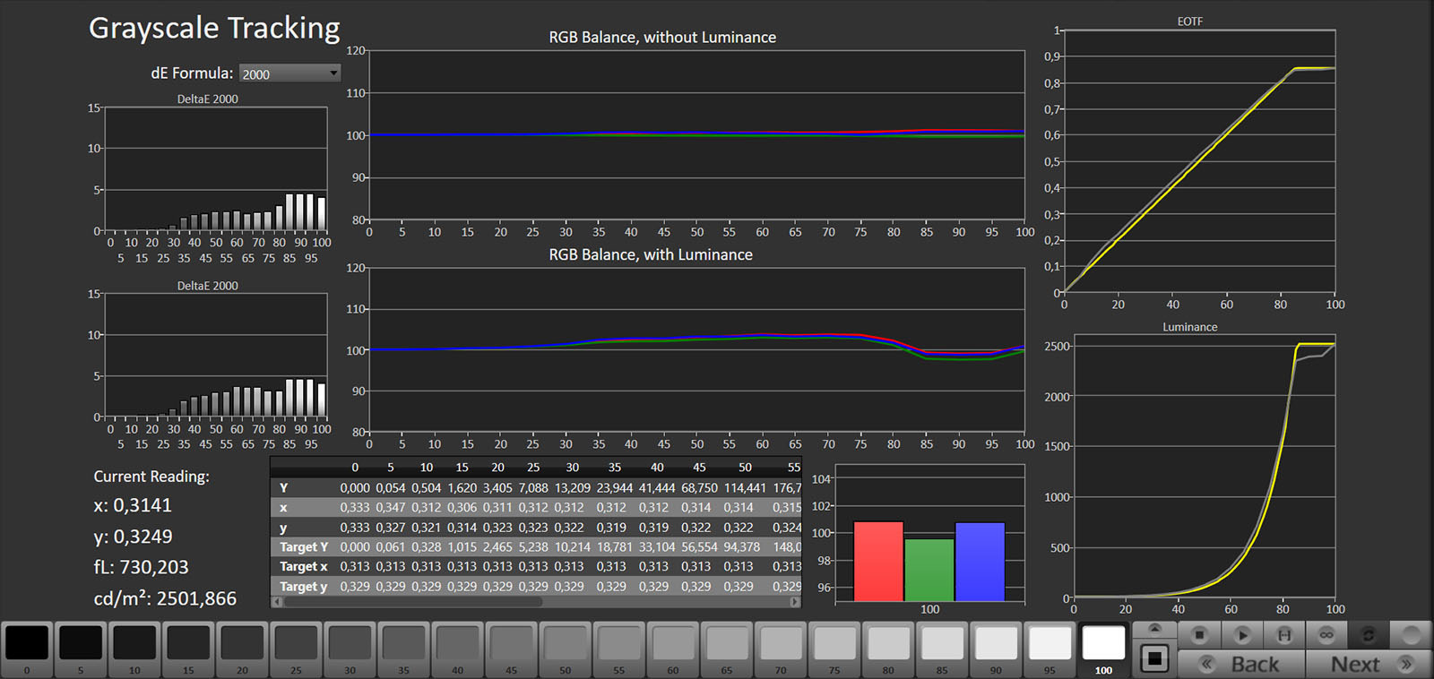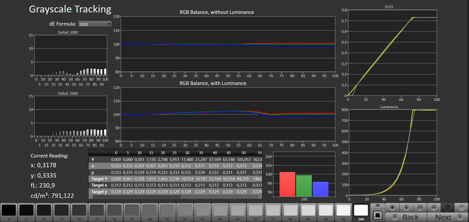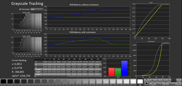 Anche il B6 utilizza la modalità Standard come impostazione predefinita, con risultati in linea con quelli già descritti per G6 e C6. La Filmmaker è invece molto più fedele e lineare: c’è solo un errore sul grigio al 5%, dove il TV ha letto il nero invece di un segnale molto scuro.