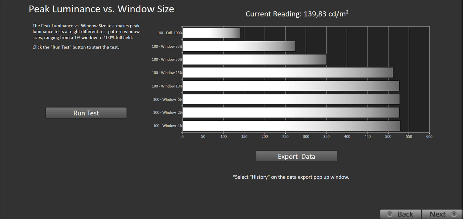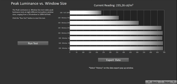 Il picco di luminanza supera di poco i 1.400 nit, risultando così circa il 17% più alto rispetto al C5 (circa 1.200 nit). A pieno schermo si raggiungono i 260 nit.
