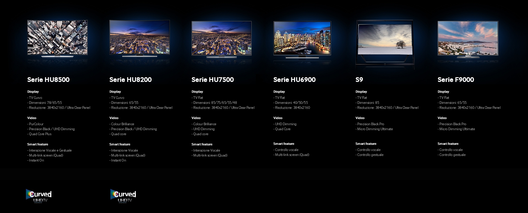 La nuova gamma TV Samsung Ultra HD è composta da 6 diverse linee di TV, organizzate in ben 16 diversi modelli, con diagonali comprese tra i 40" della linea HU6900 e gli 85" della linea HU7500 e del prestigioso modello S9. Tra queste serie ce ne sono soltanto due con pannelli curvi: la linea HU8500 con tre modelli e con diagonali rispettivamente di 78", 65" e 55". Poi c'è anche la linea HU8200, con finiture e caratteristiche molto simili ma con due soli tagli disponibili: 65" e 55".
