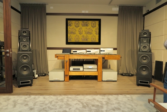 Iniziamo dalle grandi Alexx, che hanno prestato voce qui a Calco alle più imponenti formazioni sinfoniche. Come abbiamo visto nella presentazione a Monaco in primavera il sistema Alexx è un imponente diffusore che si va a collocare al di sopra delle Alexia ma ad un gradino più in basso del nuovo progetto di ammiraglia “WAMM”. Come da consolidata filosofia della casa la struttura innovativa del cabinet deriva da lunghe analisi in tema di risonanze e analisi tramite accelerometri laser. Non manca la regolazione nell'allineamento di tweeter e midrange, la scelta del condotto reflex anteriore o posteriore a determinare una flessibilità di inserimento in ambiente sconosciuta alla quasi totalità dei grandi sistemi di altoparlanti. I driver per le vie alti sono collocati nella configurazione (midrange-tweeter-midrange), con il tweeter tra i due componenti più grandi. Due distinti driver per la gamma media, uno da 14 cm ed un altro da 18 cm, mentre in gamma bassa troviamo un woofer da 26,5 cm ed un grande driver da 32. Confermata la presenza del “X-material” per la realizzazione del cabinet, ma a questo si aggiunge un materiale composito di nuova concezione (“W-material”) usato nella complessa struttura meccanica del modulo regolabile dell’unità medio-alti.