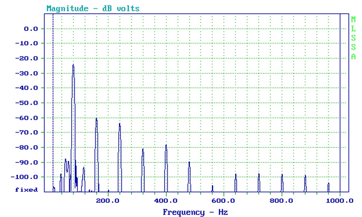 Questi segnali rappresentano la distorsione del segnale di ingresso. Come si evince dalla Figura 1 rilevata da MLSSA si può notare che ad una “bacchetta” centrata a circa 80 Hz con una tensione ai morsetti di circa 7 volt rms segue una seconda riga spettrale (amabilmente definite anch’essa bacchetta) a 160 Hz, una terza centrata a 240 Hz e così via. Questo testimonia che l’altoparlante ha generato una seconda armonica a 2 X 80 = 160 Hz, una terza armonica a 3 X 80 = 240 Hz e così via, anche se con ampiezze sempre più basse man mano che sale l’ordine delle armoniche. A bassissima frequenza, dove l’escursione aumenta notevolmente col diminuire della frequenza, la capacità di emettere una bassa distorsione diventa una caratteristica fondamentale, anche se impossibile da eliminare.