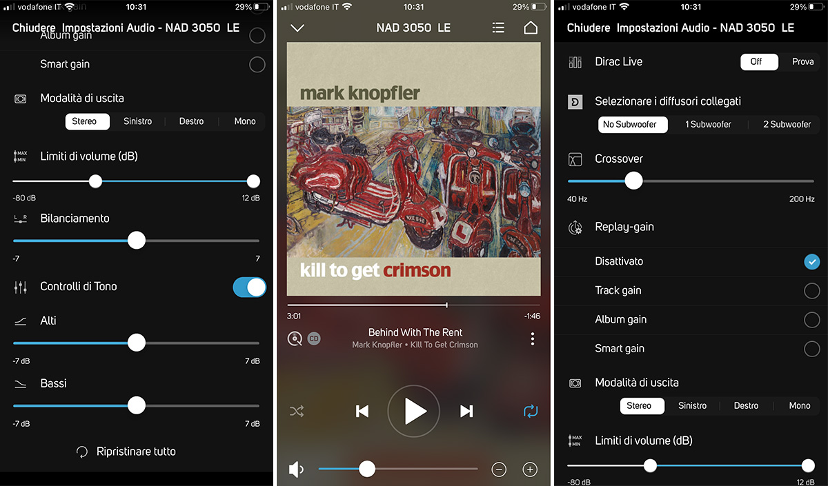 C’è anche la possibilità di attivare o disattivare la calibrazione eseguita tramite Dirac Live. Insieme al NAD viene concessa una licenza limitata per il sistema di correzione acustica ambientale, completa di microfono per effettuare le misurazioni utili a creare il profilo acustico. Questo viene poi caricato all’interno del C 3050 LE per compensare l’effetto esercitato dall’ambiente sul suono. Con la licenza limitata si può intervenire sulle frequenze fino a 500 Hz; ovviamente si può acquistare una licenza completa separatamente, in modo da poter agire sull’intero spettro. Sempre dall’app si può anche intervenire sulla frequenza di taglio del subwoofer (tra i 40 e i 200 Hz), anche per il 'passa-alto', quasi una rarità per gli amplificatori integrati dotati di uscita subwoofer.