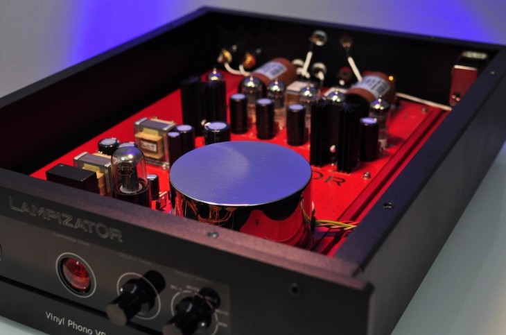 Il pre-phono è il nuovissimo LampizatOr VP4, una soluzione "one-box" che presenta sia una sezione di alimentazione che un trasformatore di "Step-Up" all'interno dello stesso telaio. Offre tre ingressi, uno per testine MM e due per testine MC. Il selettore degli ingressi è a 5 posizioni, con posizioni di 'mute' tra un ingresso e l'altro.