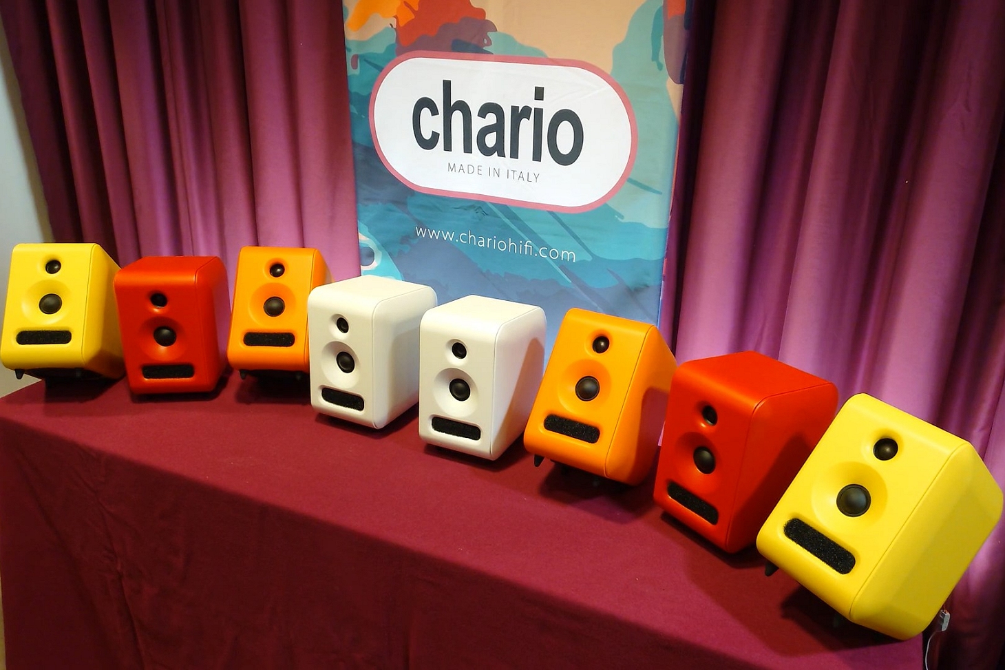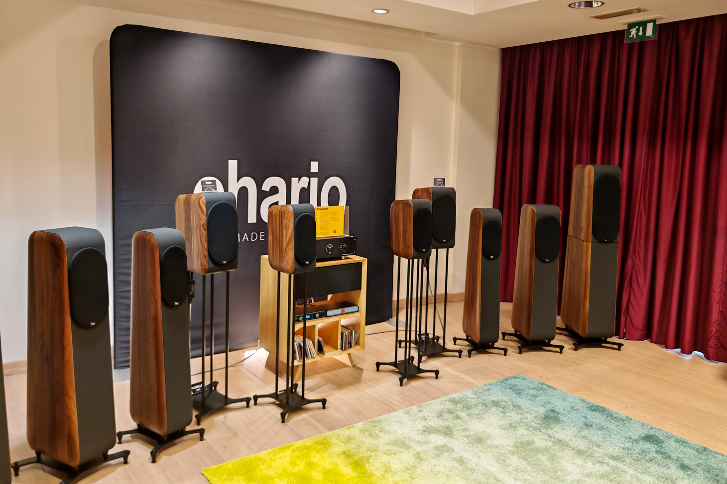 Ritornando verso il centro dei corridoi, ci siamo fermati da Chario. Purtroppo è apparso subito evidente che anche qui lo spazio per un ascolto davvero ragionato fosse oggettivamente difficile da ricavare. La sala era organizzata con due file di diffusori per ciascun lato corto, per un totale di cinque coppie per lato. Un colpo d’occhio indubbiamente interessante, ma che dal punto di vista acustico significava una cosa sola: distanza, angolazione e interazioni ambientali diventavano, di fatto, incontrollabili.