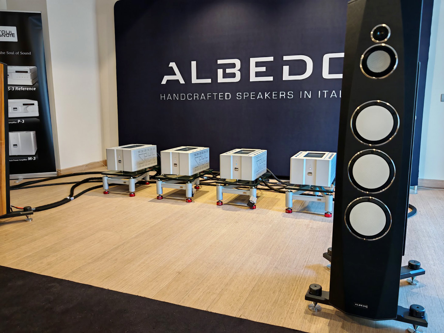 A differenza delle sale viste sino ad ora, qui si è percepita subito un’impostazione più scenografica: un plotone di amplificatori finali mono Soul Note mod. M3 X era schierato sul fondo della sala (che però non era trattata). Quando siamo entrati — o meglio, quando siamo riusciti a entrare — stava suonando Joe Bonamassa. Davanti alla porta si era formato un piccolo assembramento: segno che la curiosità era alta e che chi era dentro non aveva fretta di uscire. Il primo impatto di ascolto è stato quello che ci si aspettava da un impianto di questa caratura e dalle Albedo Aglaia: un basso presente, piuttosto pesante ma pulito, con una buona articolazione.