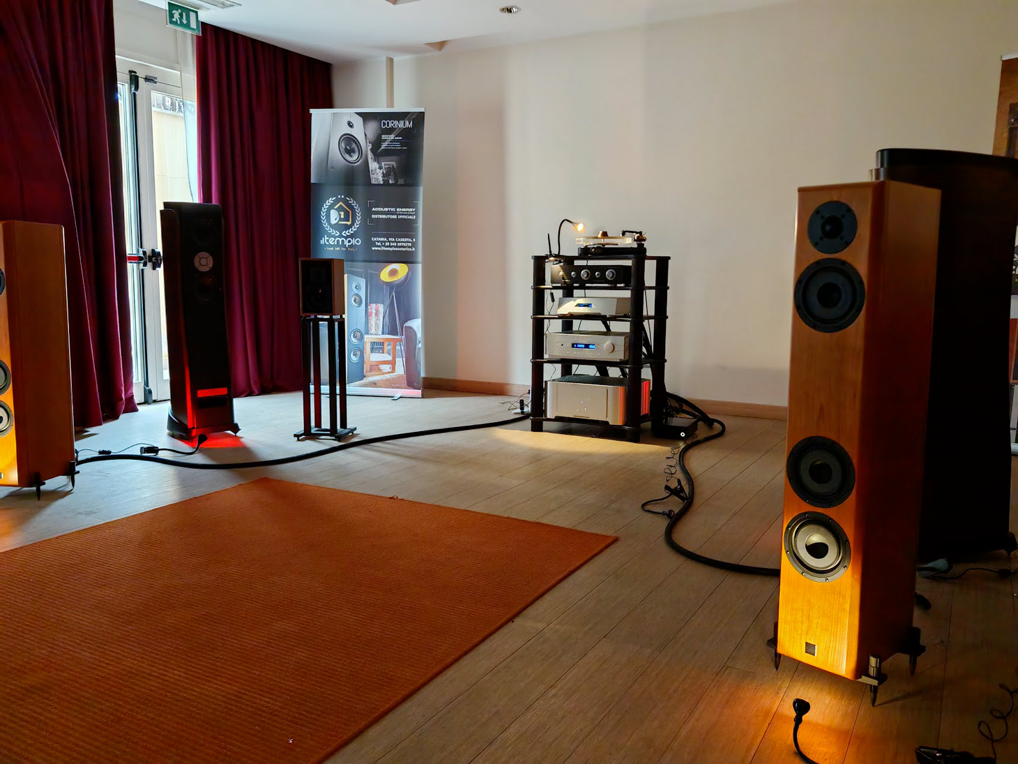 Strategicamente abbiamo saltato le prime stanze che si stagliavano all’ingresso per evitare l’affollamento famelico iniziale e ci siamo portati subito nella sala di Lyrics, posizionata in fondo al corridoio. Avevamo già saputo del suo piacevole ritorno: sì perché, per chi non lo conoscesse, Antonino, patron instancabile di Lyrics Audio, è uno dei capisaldi dell’audio romano con il suo grande negozio in quel di San Giovanni.