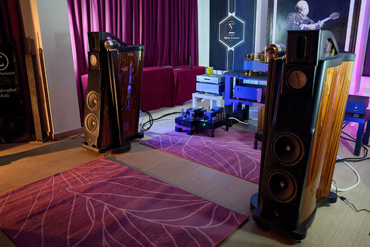 Appena entrati, il mediatore ci ha accolto subito illustrando la filosofia dietro la costruzione dei diffusori Sigma Acoustics Orchestra 2.5 con tweeter a tromba Fostex T500A MkIII separati. Il tono era pacato, curato, e invitava a concentrarsi sul dettaglio del racconto. C’è stata una lunga, molto lunga, sessione di (in)formazione sulle logiche di costruzione del diffusore con particolare riferimento al medio alto e altissimo. Il mediatore ha selezionato poi alcuni brani per portare l’attenzione su alcune caratteristiche peculiari di questo progetto. La sala era gremita, ma si percepiva rispetto: un silenzio attento accompagnava l’ascolto didattico. L’ambiente era stato trattato con tappeti, quadri, e grandi pannelli posteriori: una cura evidente. L’impressione è stata quella di un living elegante, classico, ben calibrato. È partito un brano con l’arpa. Lo strumento si è sentito con una naturalezza delicata e armoniosa. Tuttavia, la posizione di ascolto non era ideale: la folla attorno e la direzionalità marcata del diffusore limitavano un po’ la percezione complessiva. Cambio brano: voci in una chiesa.