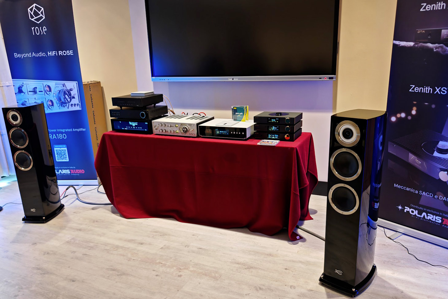 Per chi non lo sapesse, Polaris Audio è uno dei più grandi distributori italiani specializzati in soluzioni per l’alta fedeltà con sede a Roma (nonché uno dei primi distributori italiani ad includere nel proprio portafoglio prodotti di estremo oriente di cui tanto si inizia a parlare). Tra i marchi che tratta - e che ci ha portato qui in fiera - ci sono HiFi ROSE, Shanling, ONIX, LAiV Audio, Denafrips, AUNE Audio. Appena siamo entrati le numerose ma discrete elettroniche erano distribuite su un un mobile lungo a fondo parete ed a cantare per noi c’erano le Cabasse Murano Alto.