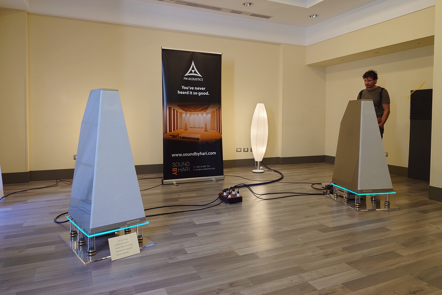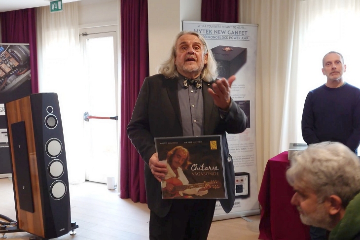 L’ascolto è proseguito e in alcuni passaggi, però, la saturazione dell’ambiente è emersa, creando un lieve senso di confusione che ha sottratto un po’ del buon dettaglio presente. Finito il brano il mediatore ha salutato tutti e ha deciso di spendere qualche secondo per parlare a tutti i visitatori. Giusto per ricordare, Sound By Hari, con sede a Šempeter pri Gorici (Slovenia) opera principalmente come distributore e promotore di diversi prodotti audio hi-fi nel mercato europeo, giusto per citarne alcuni Zellaton, FM Acoustics, Taiko Audio e altri.
