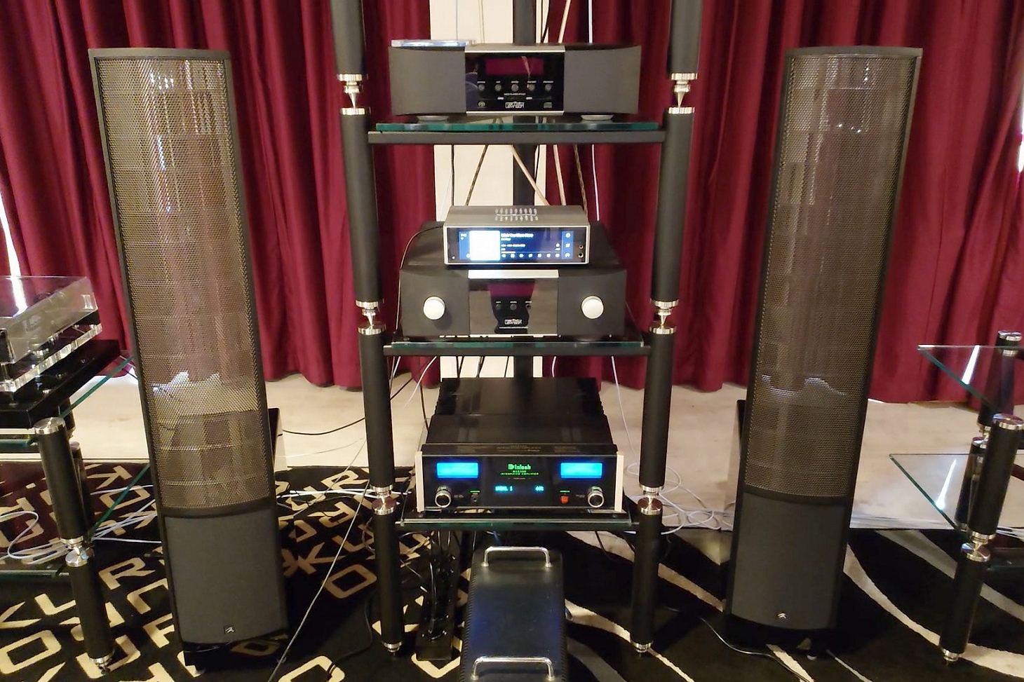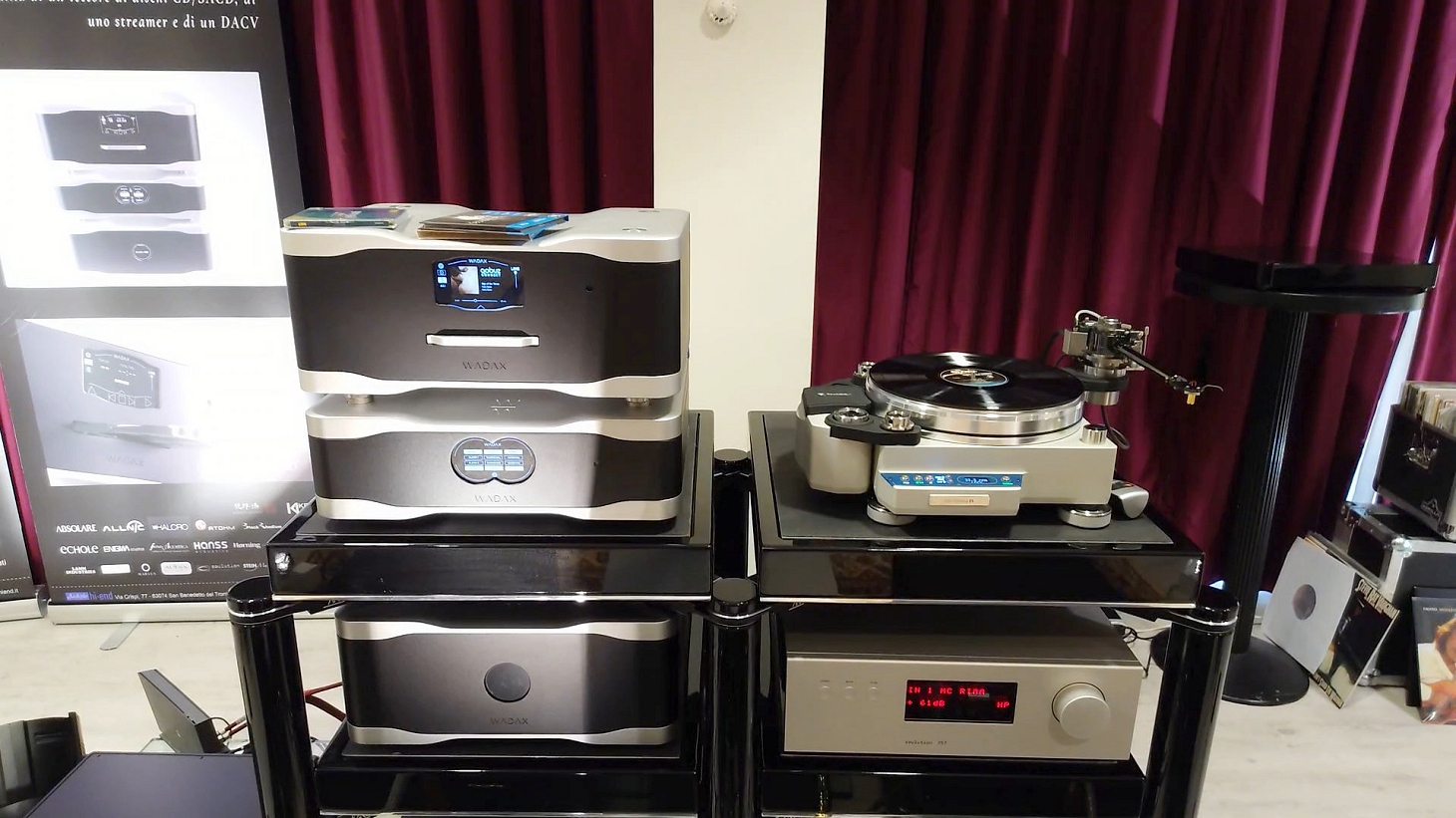 In fiera ci ha portato un vero e proprio spaccato del suo negozio, un’ambasciata dell’hi-fi, un’abbondanza di elettroniche e diffusori distribuiti sui lati lunghi della sala, esposti anche solo per il piacere della vista. In prova abbiamo potuto ascoltare brevemente due delle diverse coppie di diffusori presenti (Klipsch e Wharfedale), posizionate di fronte alla colonna delle sorgenti dove, tra le altre, spiccavano due macchine Mark Levinson e una sorgente HiFi Rose, subito dietro a due finali valvolari.