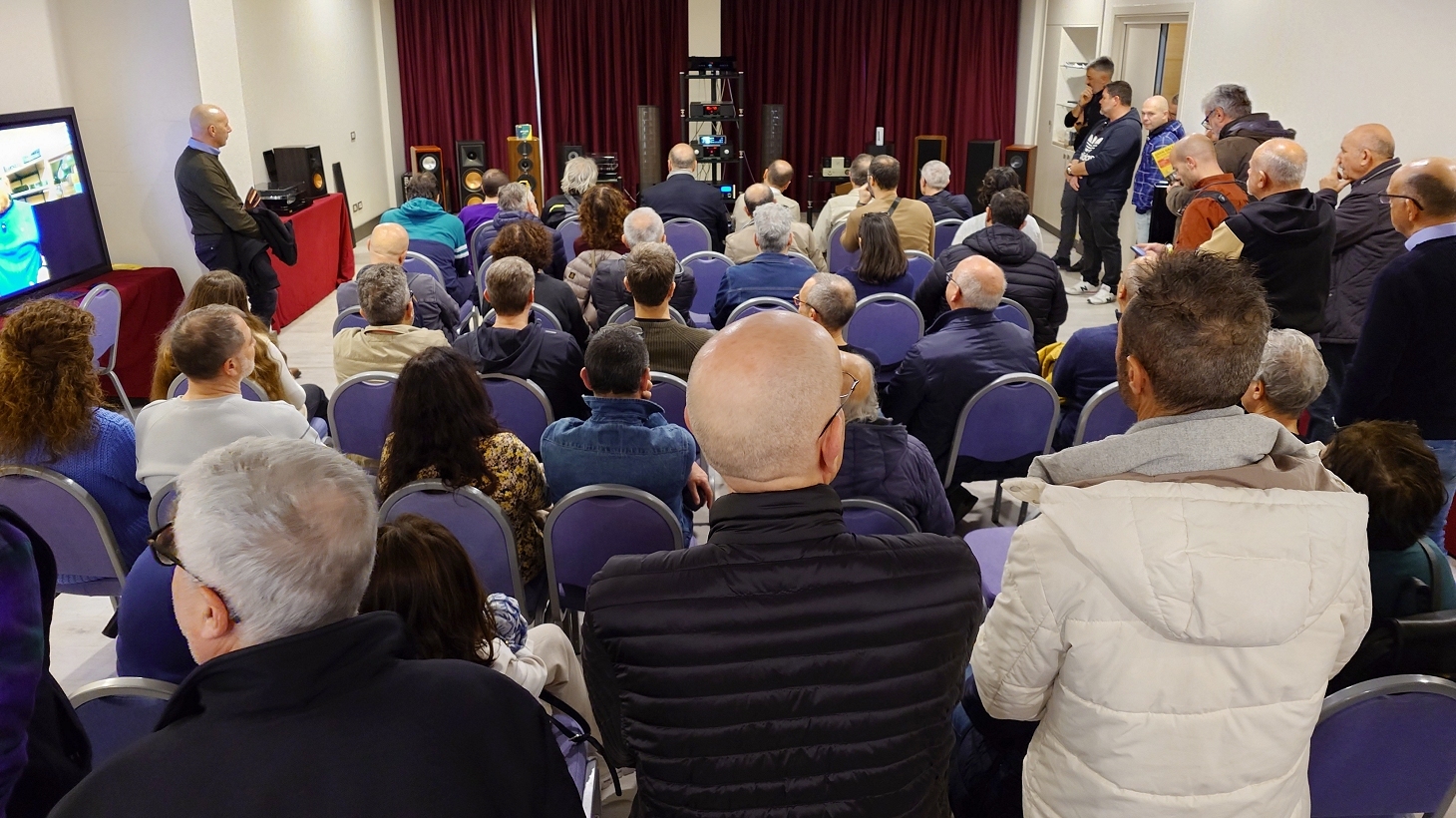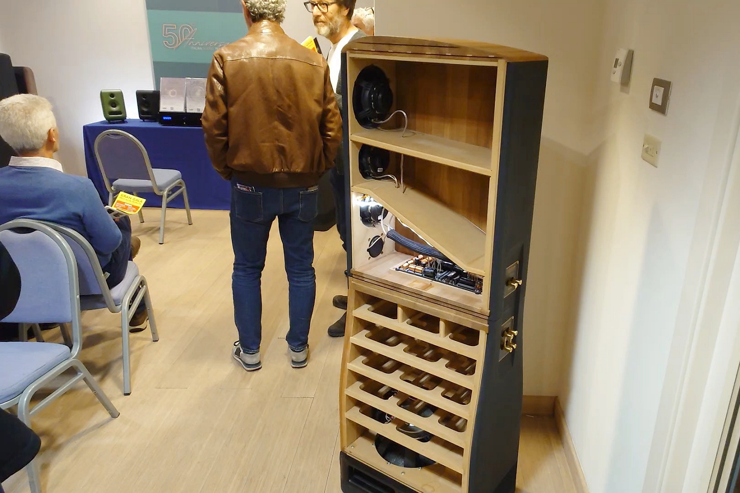 Il quadro era reso ancora più complesso dal fatto che, almeno durante la nostra visita, una coppia per lato risultava in funzione contemporaneamente. Anche in questo caso, il focus sembrava vertere più sulla “vetrina” che sull’ascolto vero e proprio. Nel frattempo il moderatore, con grande cortesia e disponibilità, dialogava con i visitatori, rispondendo alle domande e presentando i prodotti in un clima piacevole e conviviale.