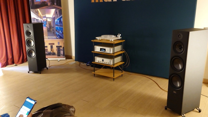 I corridoi erano ormai una fila unica, siamo riusciti a fatica a entrare da Marantz Italia. Qui si respirava subito un’aria diversa: abbiamo notato subito un setup più semplice del precedente ma non banale. La dimensione della stanza era ben calibrata rispetto al tipo di impianto presentato. Non c’era nulla di lasciato al caso e ovviamente il suono riempiva l’ambiente in modo omogeneo, senza code o saturazione, segno evidente di uno studio preliminare intelligente.