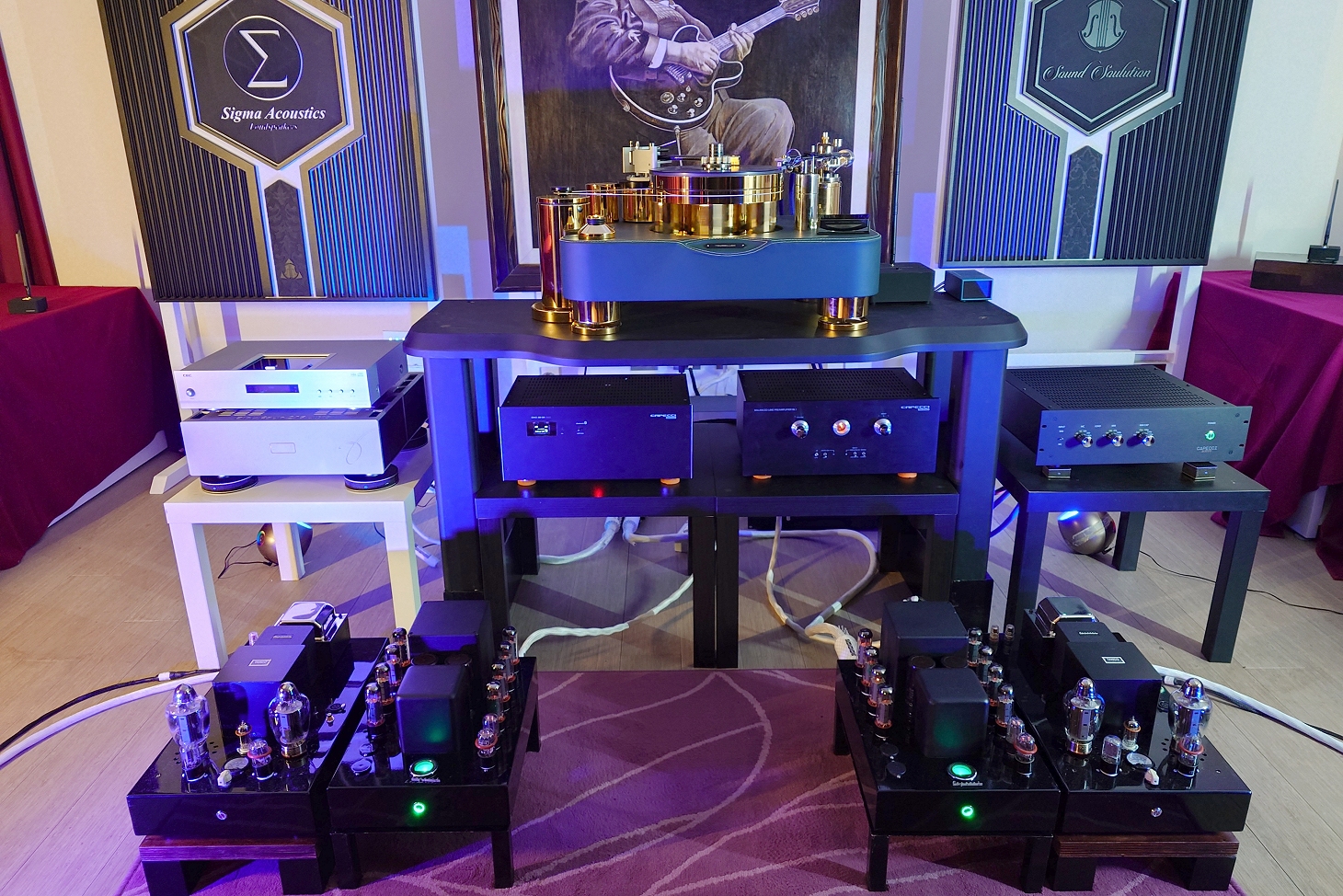 Appena entrati e ovviamente da subito il setup ci ha colpito a livello estetico: abbiamo ritrovato la presenza di quei suddetti circuiti esterni alle elettroniche, a forma di valvola: un dettaglio che trasmette attenzione al design e alla tradizione, senza sacrificare la modernità. Gli alti diffusori elettrostatici (Prodigo WR1 Ultra, marchio ungherese che sviluppa artigianalmente diffusori elettrostatici) dominavano la scena acustica con il loro fascino caratteristico: trasmettevano ambienza, spazialità e un alto dolce sempre molto coinvolgente.