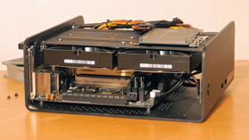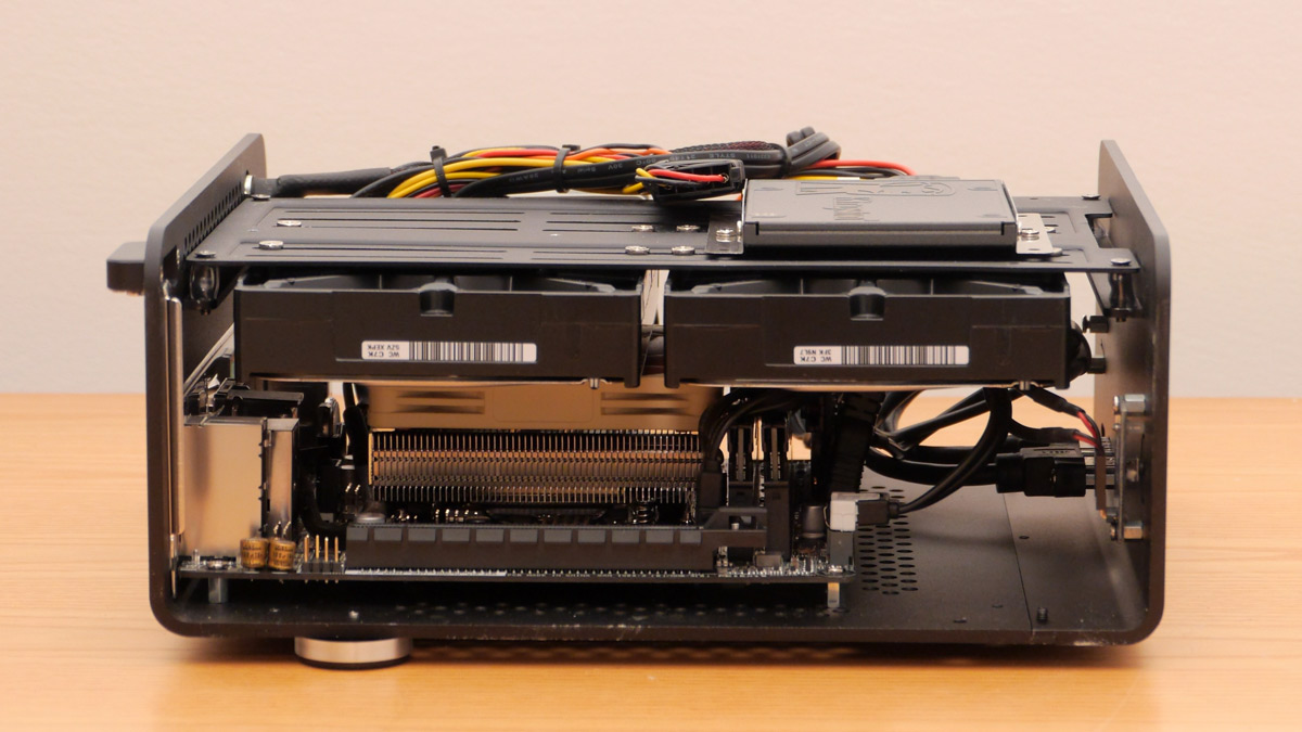 Gli spazi interni sono ben sfruttati con la motherboard montata sulla base dello chassis, due hardisk appena al di sopra della generosa ventola NOCTUA , agganciati ad una staffa che sorregge anche la SSD di sistema. Rimane una buona parte del volume interno non utilizzata che aiuta nella circolazione dell'aria. Ovviamente il kino-2 non è una workstation soggetta a grossi carichi di lavoro ma è sempre bene tenere in considerazione una efficiente dissipazione termica.