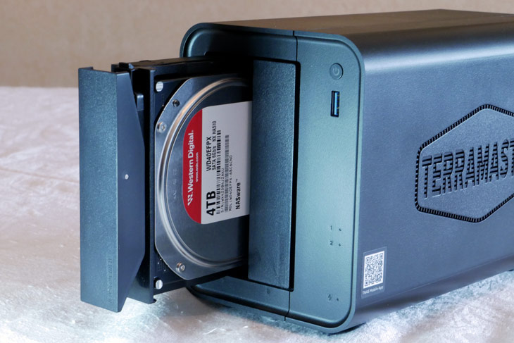 L’estrazione della baia avviene tramite un gancio frontale a leva, che semplifica la rimozione del disco in totale sicurezza. Questa soluzione non solo accelera le operazioni di manutenzione e upgrade, ma riduce anche il rischio di danneggiamenti, offrendo all’utente un sistema robusto e immediato per la gestione dello storage. Tutto il montaggio, grazie all'estrema facilità, si è risolto in qualche minuto. In particolare, abbiamo utilizzato due HDD da 3,5" Western Digital RED Plus da 4 Terabyte ciascuno.