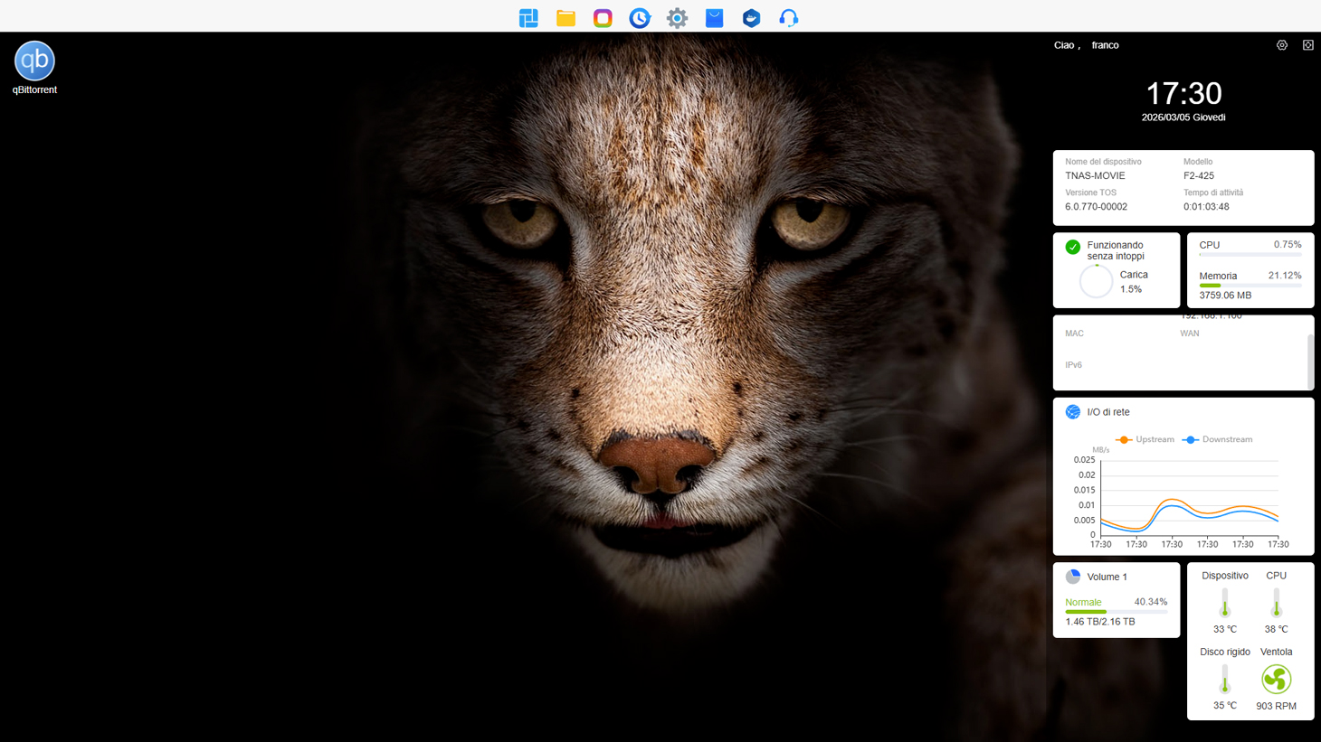 Durante l’utilizzo quotidiano l’interfaccia di TOS 6.0 si è dimostrata generalmente fluida e reattiva. Il caricamento del pannello di controllo e delle applicazioni principali avviene in tempi contenuti e la navigazione tra le varie sezioni del sistema risulta immediata anche durante trasferimenti di file in background. Il processore Intel Celeron N5095 e i 4 GB di memoria installati offrono quindi una base adeguata per gestire contemporaneamente servizi di rete, condivisione file e applicazioni installate.