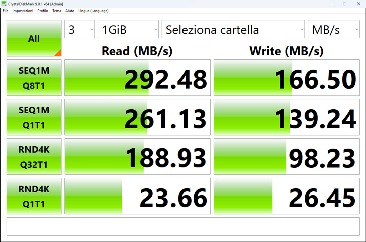 Abbiamo effettuato un test anche con CrystalDiskMark, un benchmark che utilizziamo frequentemente per la misurazione del throughput di dispositivi di memorizzazione, sia meccanici che a stato solido, sfruttando il nostro server di rete come disco di rete collegato al PC. I valori ottenuti sono compatibili con quanto risultato dai test di trasferimento file, con un valore per la lettura sequenziale addirittura superiore al limite teorico per una rete a 2,5Gbps e un valore in scrittura ampiamente pià elevato rispetto a quello che si otterrebbe in pratica con una classica rete da 1 Gbps.