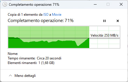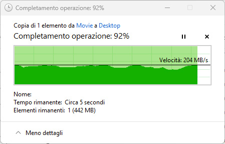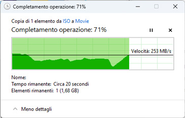 Per valutare il comportamento reale dello storage abbiamo effettuato alcune prove di trasferimento tramite protocollo SMB da un PC Windows 11 collegato alla rete 2,5 GbE. Copiando file di grandi dimensioni (oltre 5 GB) abbiamo rilevato velocità di trasferimento comprese mediamente tra circa 180 e 260 MB/s, valori coerenti con l’utilizzo di dischi meccanici in configurazione ridondante e con il limite teorico della connessione di rete. Durante i trasferimenti prolungati l’utilizzo della CPU del NAS è rimasto contenuto, segno che il processore Intel Celeron N5095 riesce a gestire il traffico di rete senza diventare un collo di bottiglia.