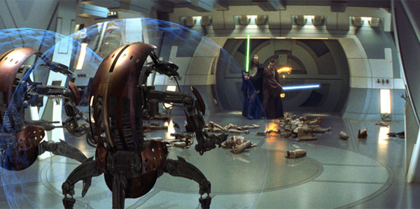 Ci sono però anche sequenze positive. La maggiore profondità di scena donata dal 3D è visibile nelle inquadrature a campo medio, mentre guadagnano interesse i fotogrammi nello spazio, con le astronavi sospese e ben distanti dal fondale stellato (su tutte l'imponente nave madre della Federazione dei Mercanti). Bene anche gli elementi in trasparenza, verso i quali nutrivamo più di una perplessità: spade laser e ologrammi vengono proiettati senza infastidire la visione 3D, così come l'effetto blur delle ali di Watto.