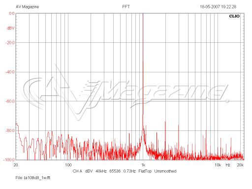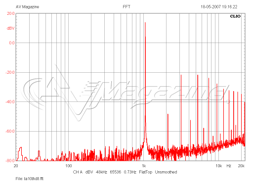 I picchi posizionati a 3.000 Hz e 5.000 Hz rappresentano rispettivamente le distorsioni di terza e quinta armonica che devono essere molto contenute poiché sono molto poco gradite al nostro orecchio. Ebbene, la seconda e la terza armonica sono bassissime, ridotte ad una frazione di un millesimo del segnale di ingresso, con il rumore di fondo ancora più contenuto.