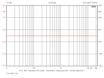 Il grafico qui in alto si riferisce alla diafonia (separazione) di un amplificatore ideale. In pratica la separazione tra i due canali stereofonici non soltanto è molto elevata (135 dB) ma è anche costante su tutto lo spettro delle frequenze riprodotte. Con una prestazione del genere, la separazione è praticamente assoluta: nessun suono che deve essere riprodotto esclusivamente da un canale verrà riprodotto anche dal canale opposto. Qui in basso invece potete osservare il grafico di diafonia dell'amplificatore t-amp.