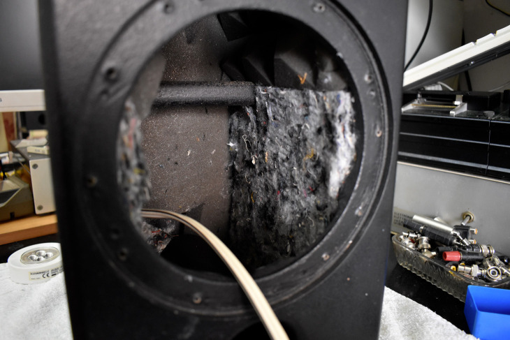 Breve descrizione del modello: Si tratta di un diffusore a due vie da stand abbastanza solido, ma comunque realizzato col solito parallelepipedo senza particolari fronzoli. Vi faccio notare comunque che in studio di registrazione i fronzoli contano poco. I rapporti tra le varie dimensioni, ovvero larghezza, altezza e profondità sono stati scelti per minimizzare l’insorgere di onde stazionarie assieme al materiale assorbente.