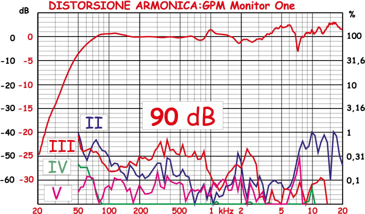 THD: Ad 85 dB di pressione media le componenti armoniche partono da -42 dB e scendono a -55 dB con le armoniche superiori vicine al fondo del grafico. A 90 ed a 95, a circa 16,5 volt picco/picco per la pressione maggiore, i valori appaiono sostanzialmente simili, con la terza armonica e le componenti di ordine superiore che ai 95 dB addirittura diminuiscono, con la quinta che si attesta sui -66 dB.