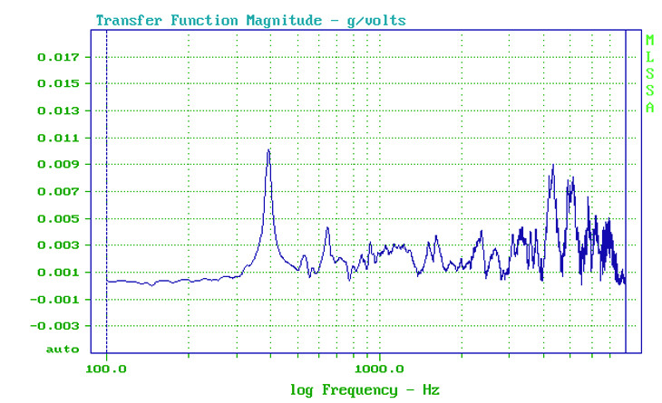 In Figura 2 vediamo lo sviluppo nel tempo della vibrazione al cessare dell’impulso di prova che vale ben 8,2 volt rms. Anche in questo caso con ampiezze limitate vediamo come anche la durata sia ben contenuta. Notate ancora la risonanza a 388 Hz che in realtà è presente in tutte le misure che ho effettuato e che rappresenta, credo, la risonanza del medium density utilizzato. Credo che con un mdf meno denso avrei ottenuto una frequenza di risonanza simile perché diminuisce la massa ma aumenta la cedevolezza.