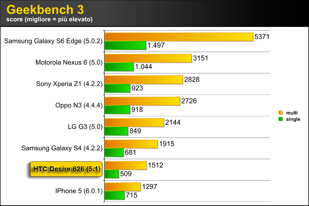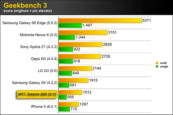 Anche nelle analisi delle prestazioni dell'HTC Desire 626 abbiamo cercato di utilizzare unicamente benchmark che ci permettessero di comparare dispositivi con sistema operativo differente come Android e iOS. Tra i software di benchmarking "cross-platform" come System Benchmark abbiamo utilizzato GeekBench 3, che distingue le prestazioni single-core da quelle multi-core.