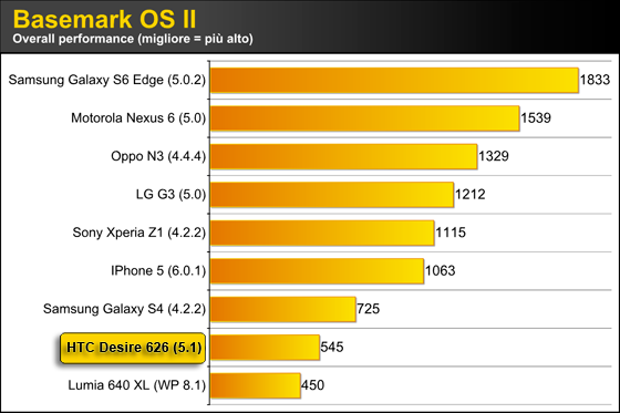 Anche Basemark OS II, altro benchmark cross-platform "All-In-One" che valuta le prestazioni generali di qualsiasi dispositivo Android, iOS e Windows Phone, conferma i non esaltanti risultati che già si evincevano con GeekBench 3, relegando il Desire 626 al ruolo di fanalino di coda assieme al Lumia 640 XL.