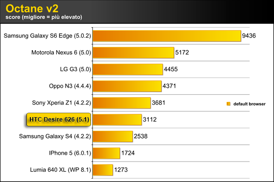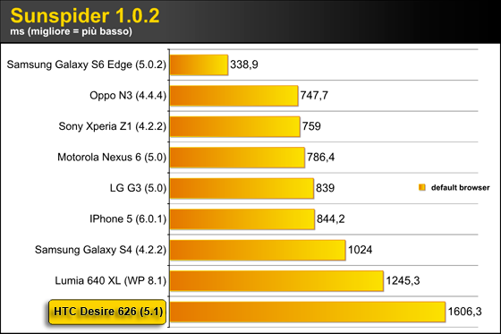 Come possiamo vedere dal grafico dei risultati del test, il Desire 626 non spicca certo a livello di pure prestazioni di calcolo e di performance hardware come d'altronde era prevedibile andando a dare un'occhiata alle specifiche tecniche. Con il suo Snapdragon 410 si pone tra gli ultimi della lista, dietro anche a telefoni top di gamma però di generazioni precedenti.