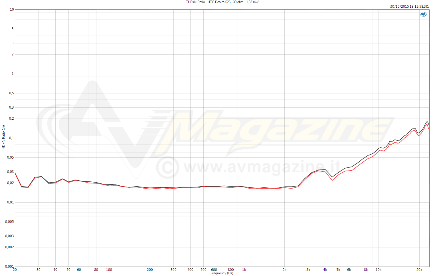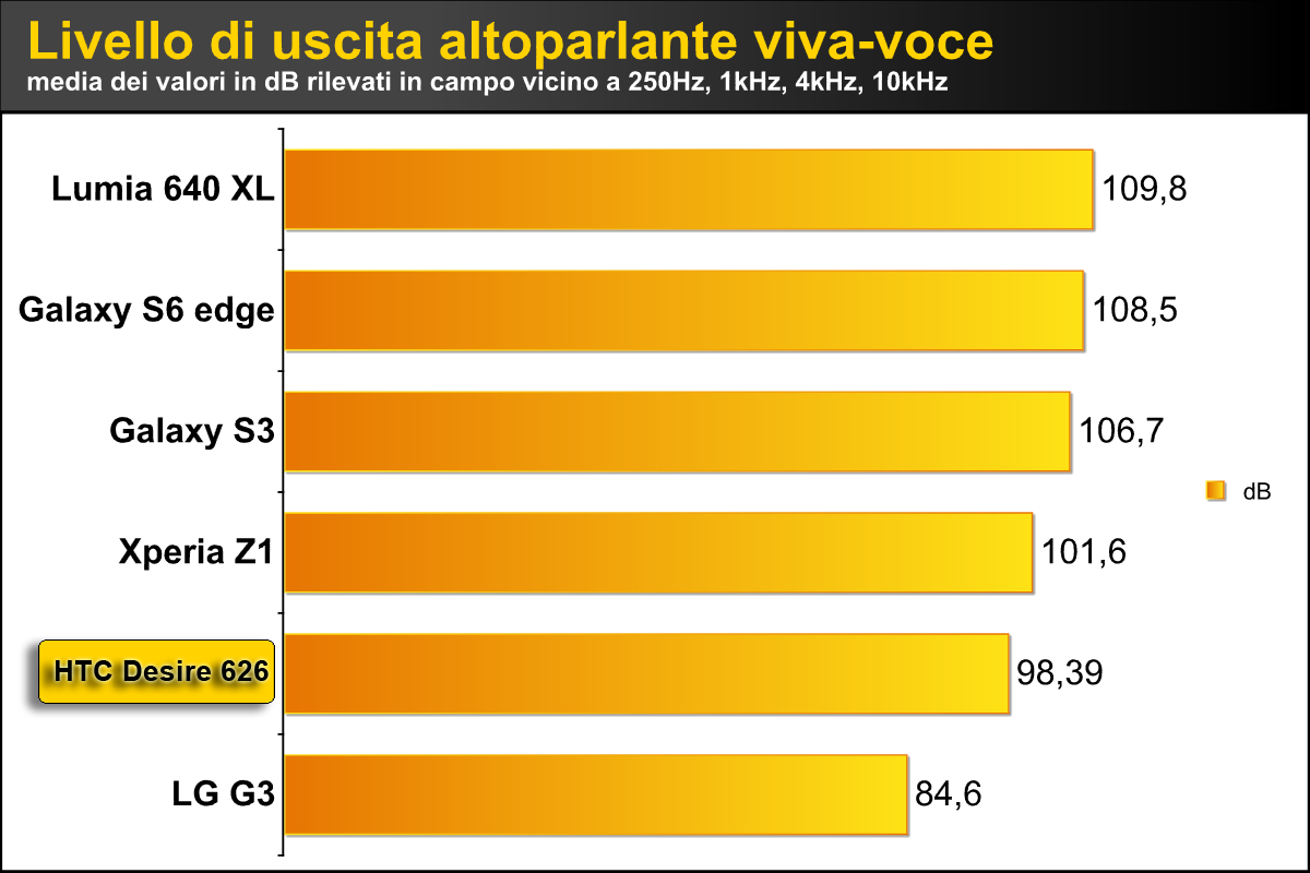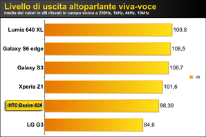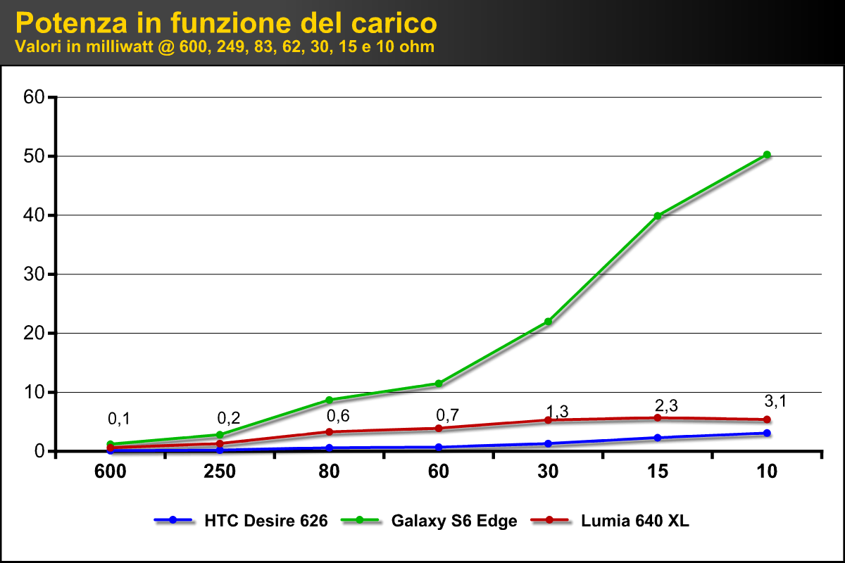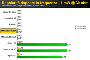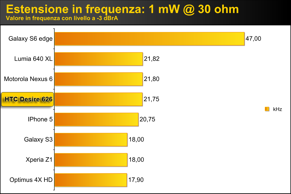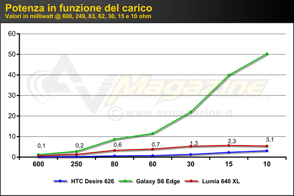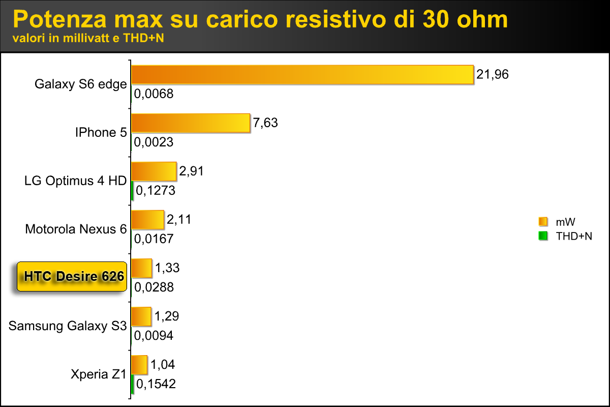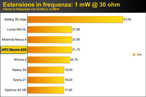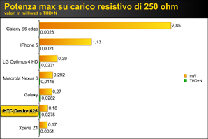 Per quanto riguarda il benchmark per la potenza d'uscita, il Desire 626 supera comunque con decisione due smartphone top di gamma di qualche anno fa, come il Sony Xperia Z1 e il Galaxy S3, quando il carico resistivo di riferimento è fissato a 30 ohm.