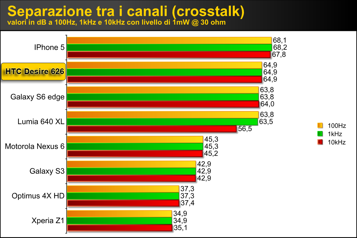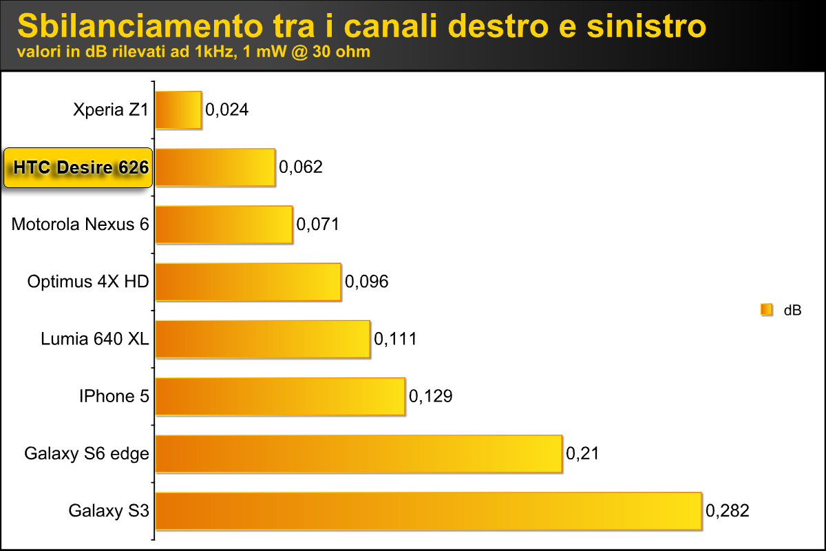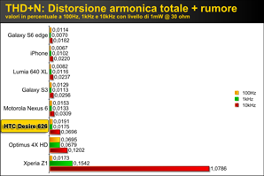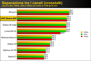 Per quanto riguarda la diafonia, ovvero la separazione tra i due canali, e lo sbilanciamento tra i due canali (differenza di livello di uscita tra il canale sinistro e quello destro) Il Desire 626 sale in cattedra e fornisce prestazioni impensabili per un prodotto di fascia medio-bassa.