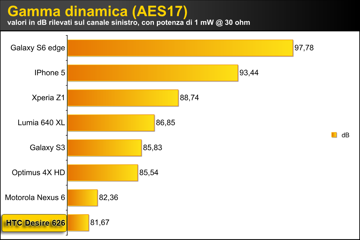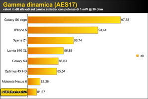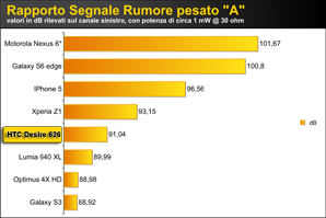 Se su riposta in frequenza e distorsione il Desire 626 può rivaleggiare con i migliori prodotti sul mercato, sul rapporto segnale/disturbo e sulla gamma dinamica viene distanziato in misura maggiore anche se i valori registrati sono ancora molto buoni. Approfittiamo anche per una nota che riguarda il valore registrato dal Nexus 6 nel rapporto S/N: in questo caso, la distanza dal valore di gamma dinamica (pari a 82 dB) suggerisce lo spegnimento dell'uscita in asenza di segnale, quindi non è da prendere in considerazione.