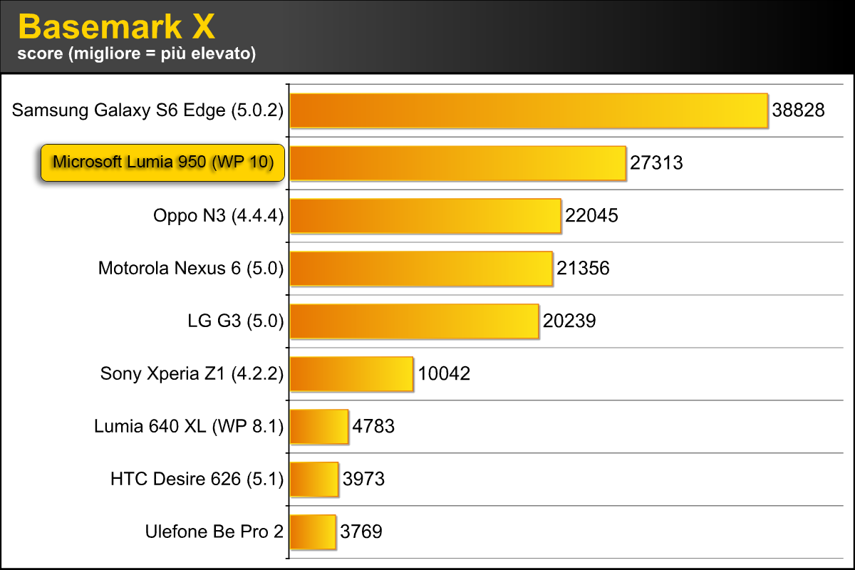 A differenza degli altri sistemi operativi, Windows Phone non ci mette a disposizione tutti i benchmark che abbiamo usato per la valutazione di smartphone Android o iOS. Nonostante ciò, i test utilizzati ci danno una chiara idea delle prestazioni del dispositivo. Utilizzando lo smartphone normalmente, abbiamo avuto l'impressione che l'interfaccia del Microsoft Lumia 950 avesse ottime performance con la sua velocità e fluidità nella navigazione tra i menù, nella galleria, la prontezza nel lancio delle applicazioni e la mancanza di microscatti; in realtà tutti i test effettuati hanno confermato quelle che erano le nostre aspettative dando uno sguardo alle caratteristiche hardware in dotazione al device che sono ottime ma non al pari dei modelli top di gamma dei competitor.