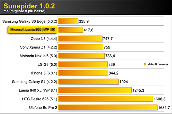Altri sistemi di benchmarking universali sono i browser benchmark che "girando" appunto grazie ad un semplice browser presente in qualsiasi SO, ci danno un' idea delle performance del dispositivo indipendentemente dal sistema operativo montato sullo stesso, anche se sono legati alla "bontà" del browser. Noi abbiamo scelto di utilizzare Sunspider nella version 1.0.2 e Google Octane v. 2 usando il browser di default per effettuare il test. Con Sunspider le prestazioni del Lumia 950 sono più che buone seconde solo al Samsung Galaxy s6 edge con il suo octacore Exynos 7420.