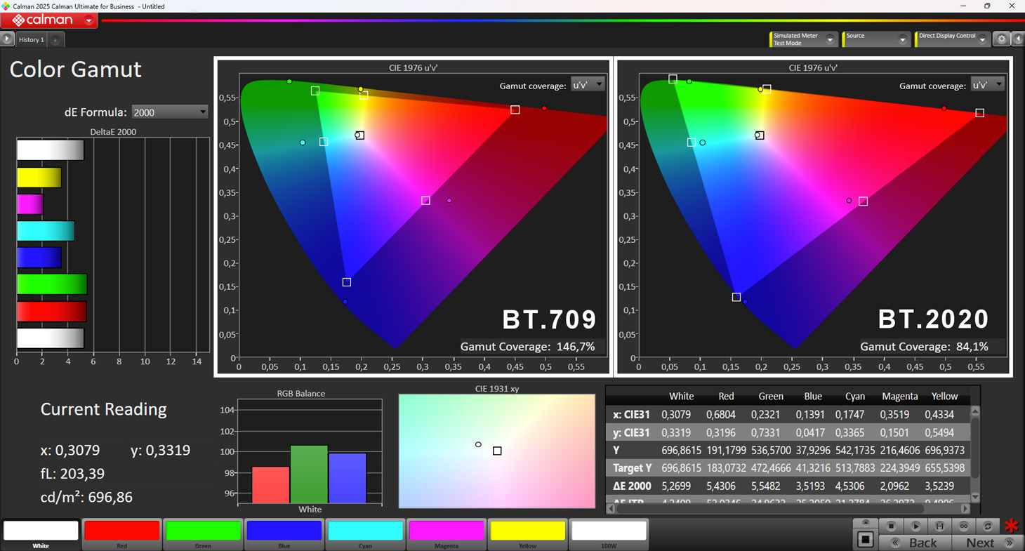 Il bilanciamento del bianco è molto vicino al riferimento D65, il gamut come abbiamo visto è decisamente grande con colori ben saturi e il gamma medio, anche se non si tratta di un display che riprodurrà foto o immagini, è vicino a 2.0. Il display è quindi di qualità elevata e con potenza luminosa dichiarata sostanzialmente coirretta e più che adeguata alle necessità.