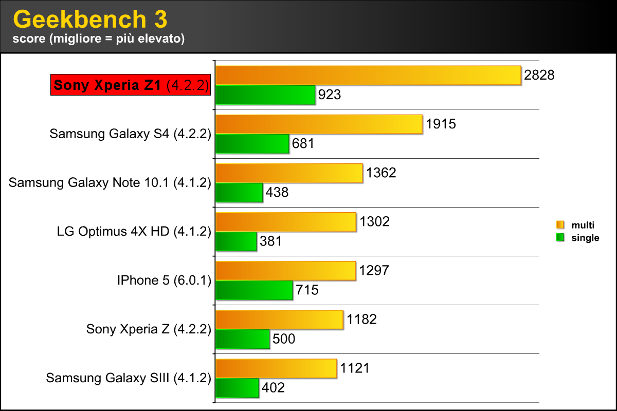Geekbench 3 è il primo benchmark cross-platform che ci permette di confrontare smartphone con sistemi operativi differenti rispetto ad Android, come l'iPhone 5 e altri che inseriremo prossimamente. Geekbench conferma il notevole aumento di prestazioni del Sony Xperia Z1 rispetto a tutti gli smartphone di generazione precedente.